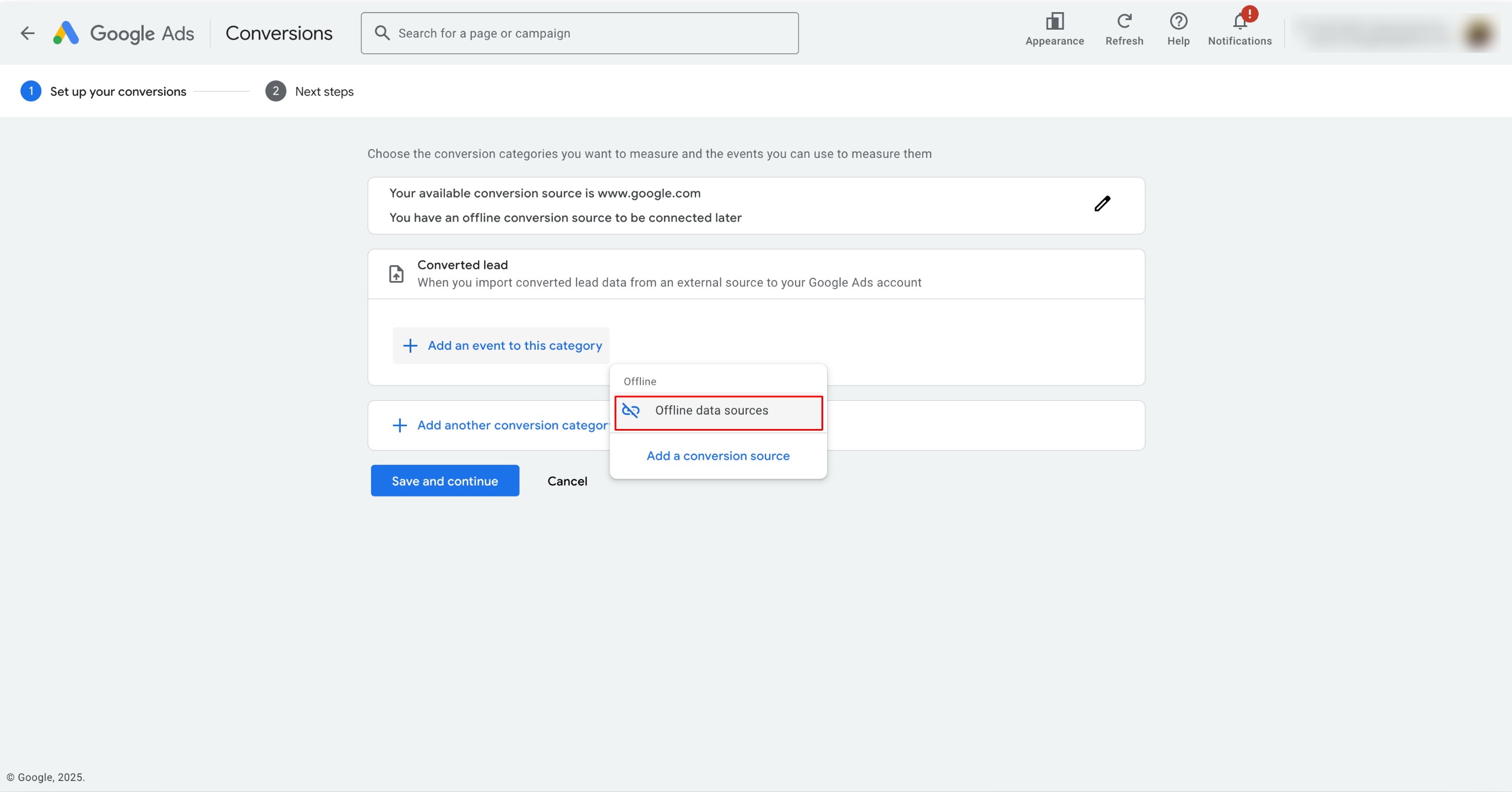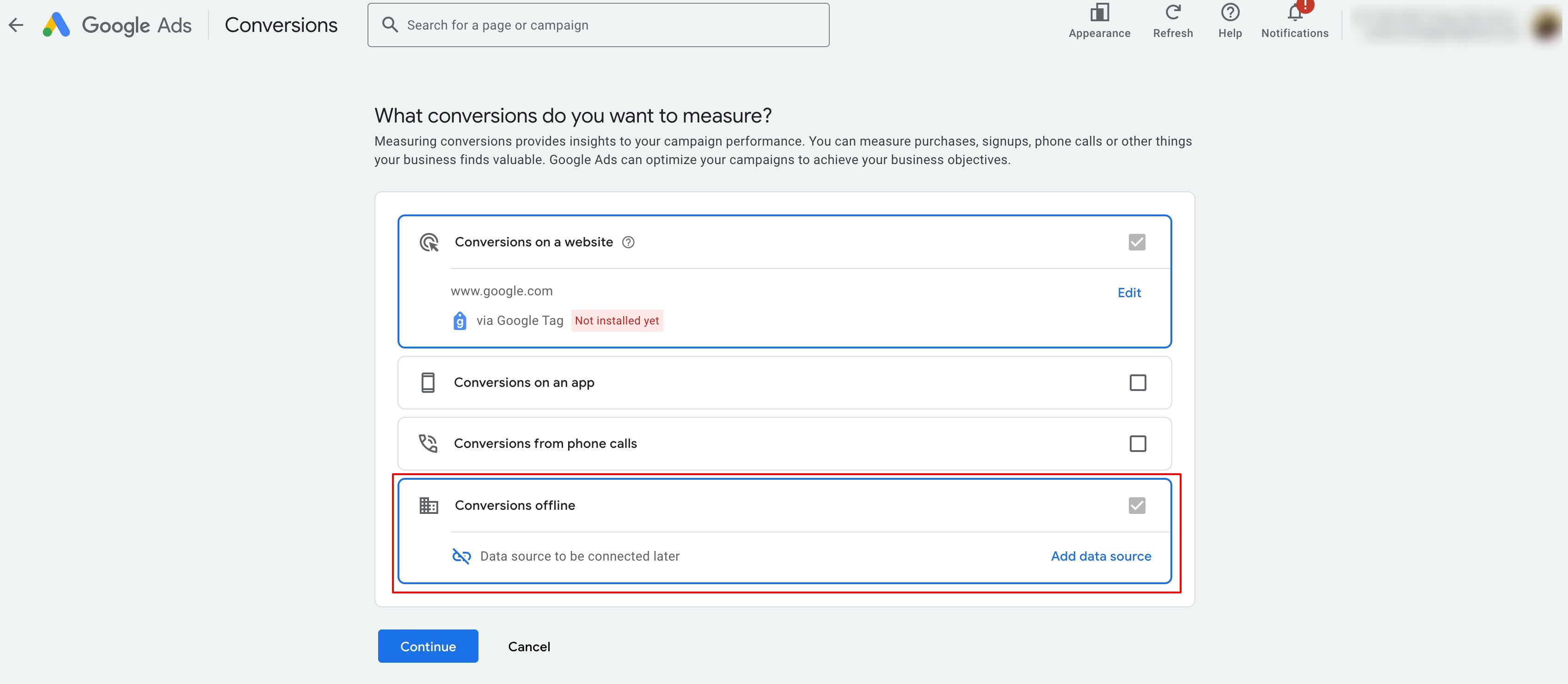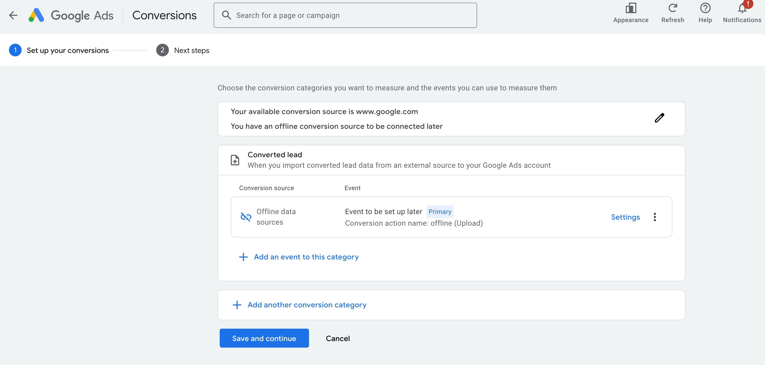 Click on the 'Create' button on top left and select 'Conversion action' to land on the same page as above to create a new conversion action.