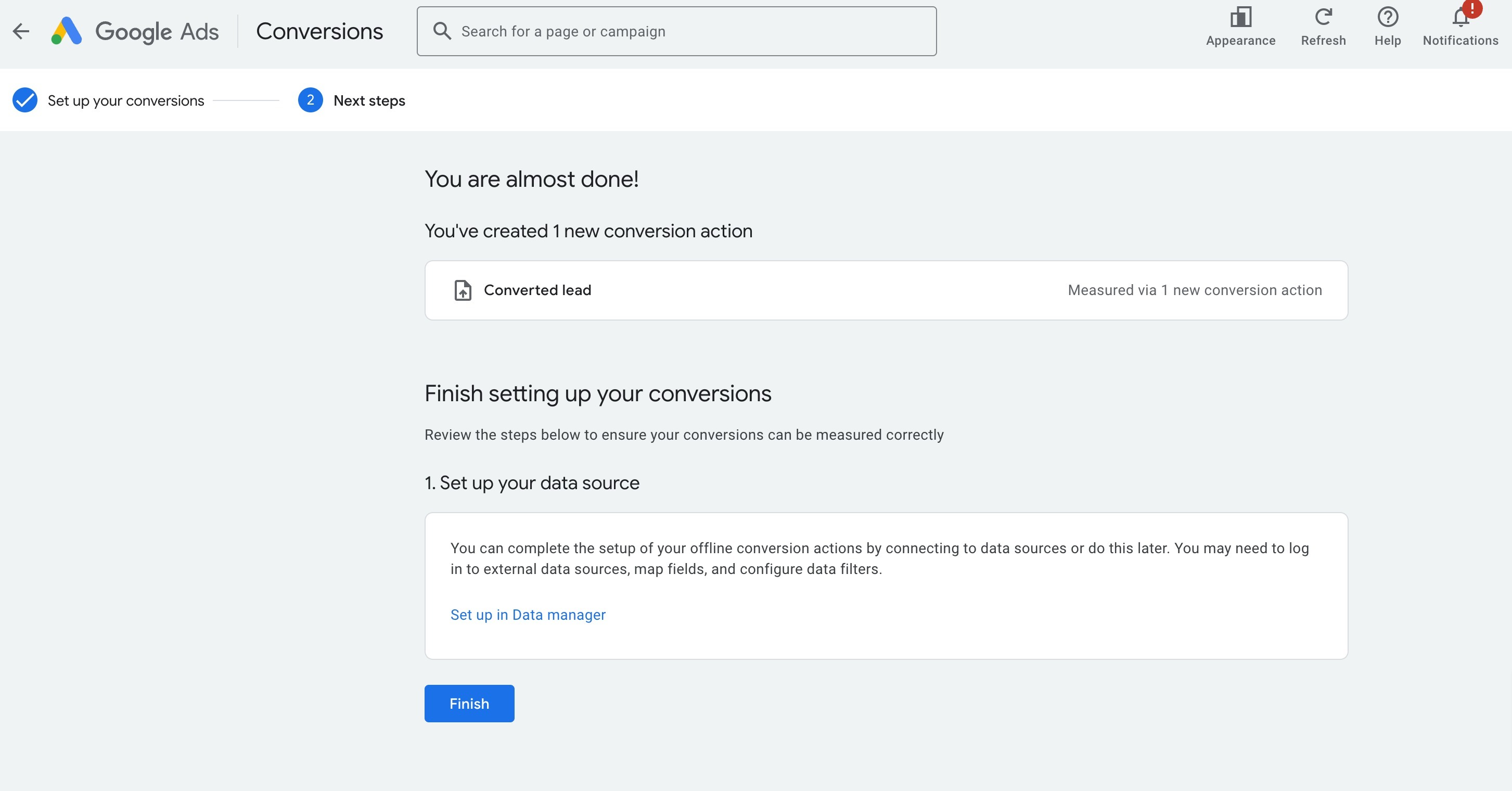 Click on Finish to conclude the conversion creation process.