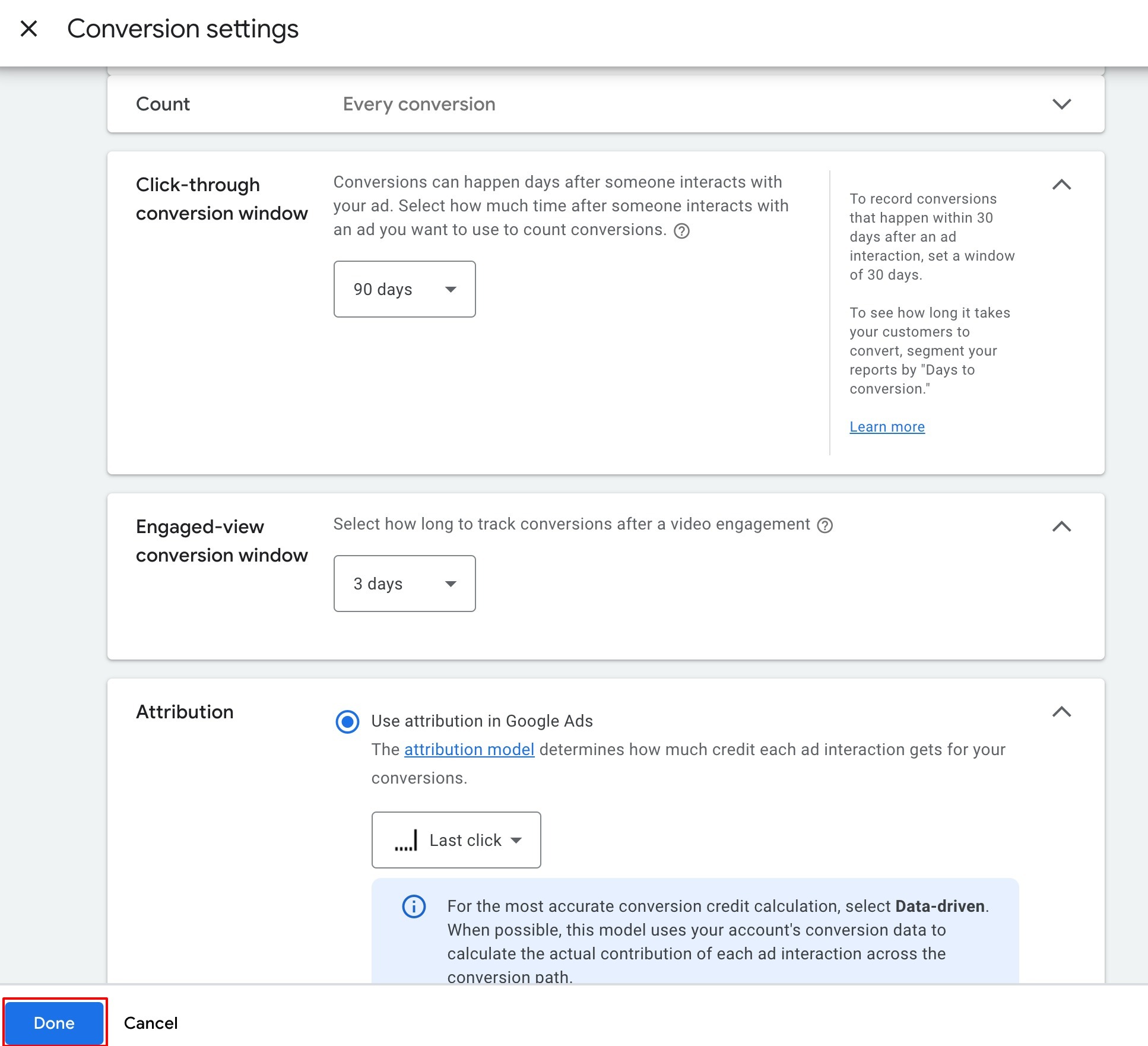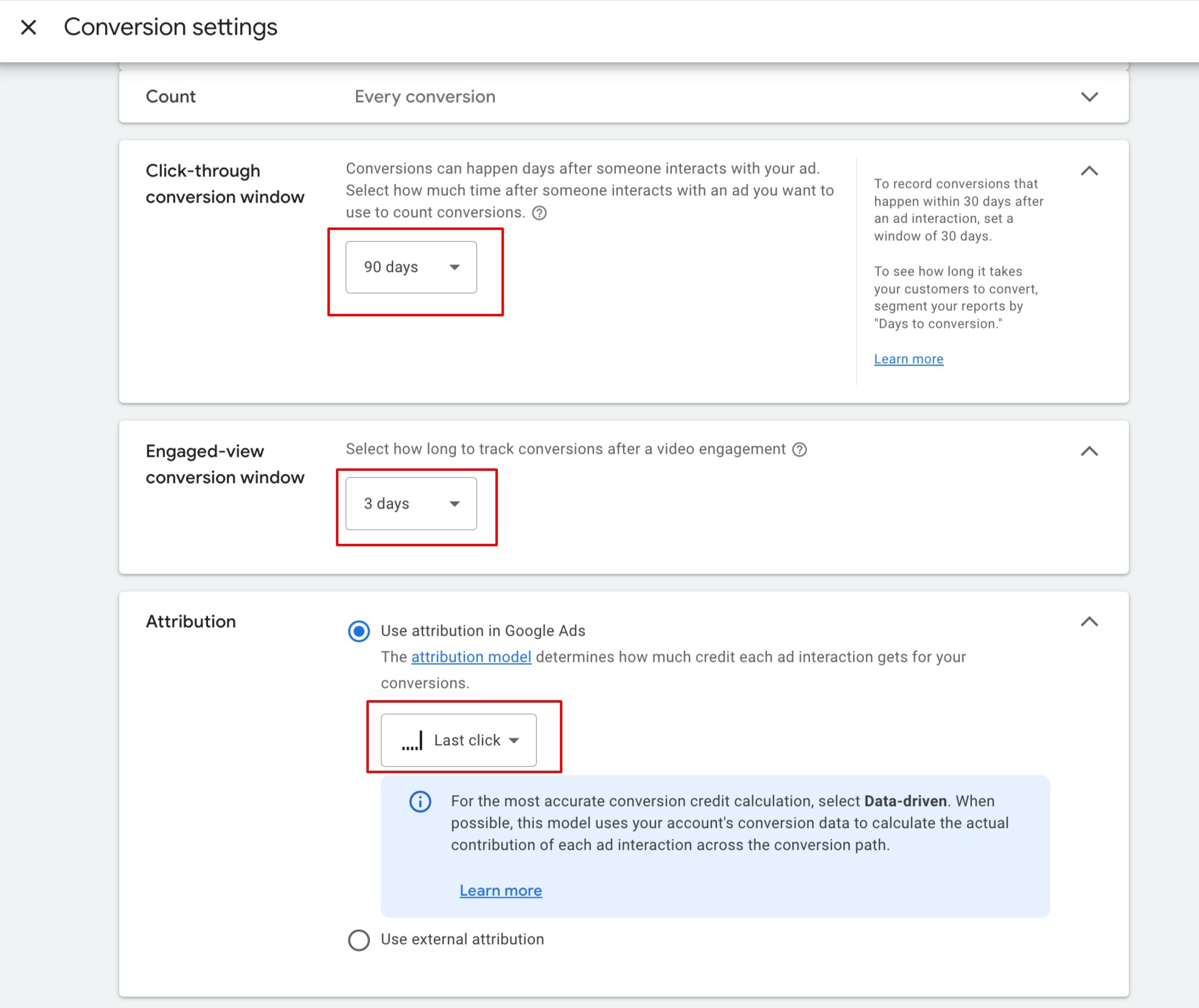 1. Set the click-through conversion window to "90 days"