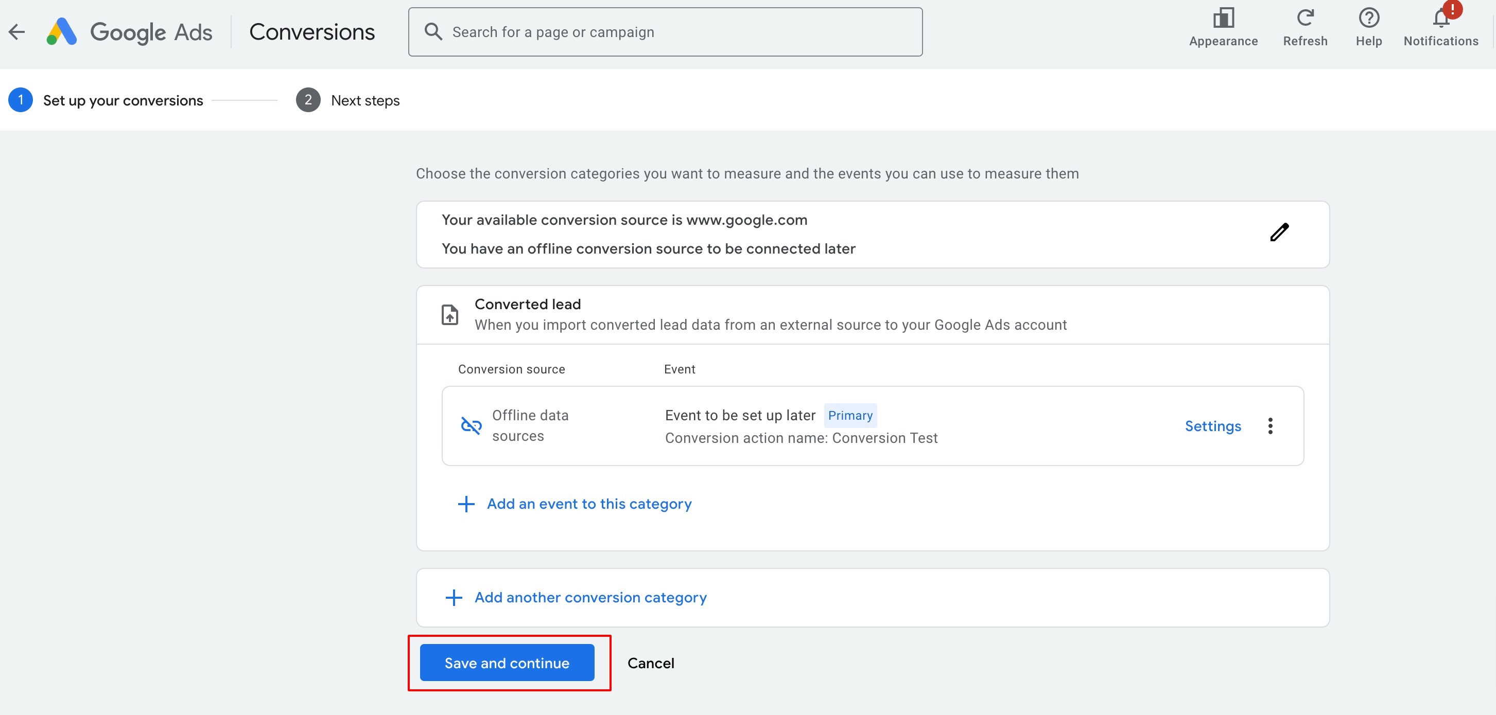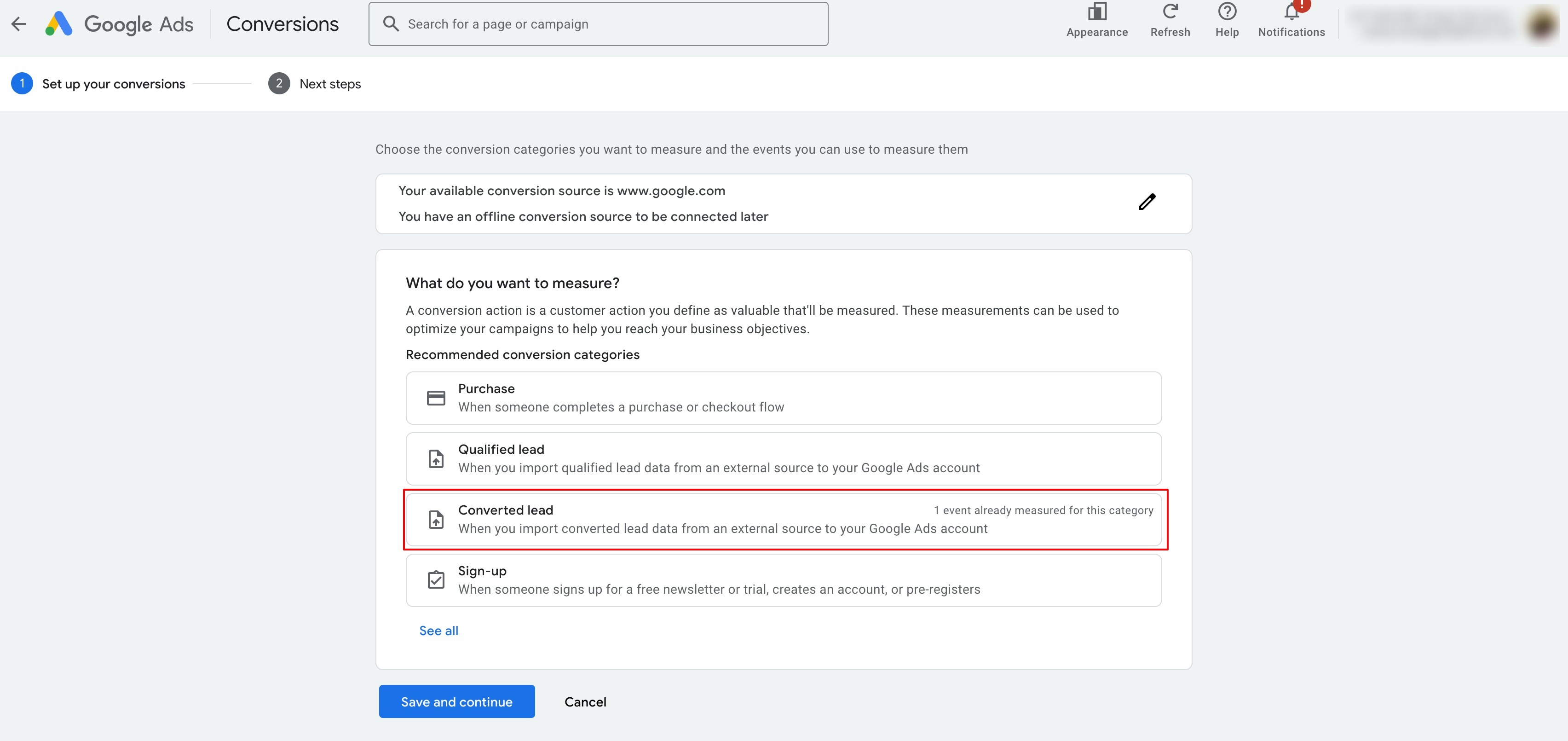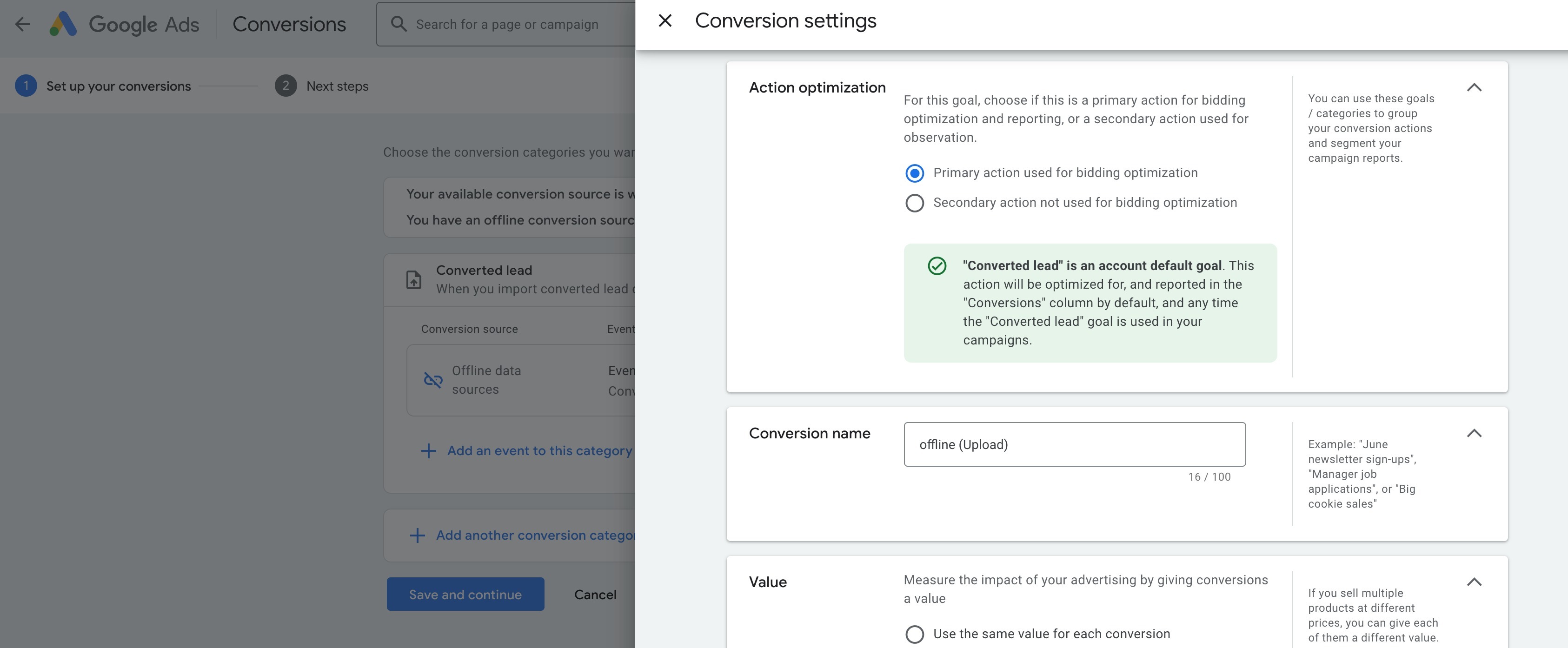 This step is to define, "What do you want to measure?" > Select Converted lead: