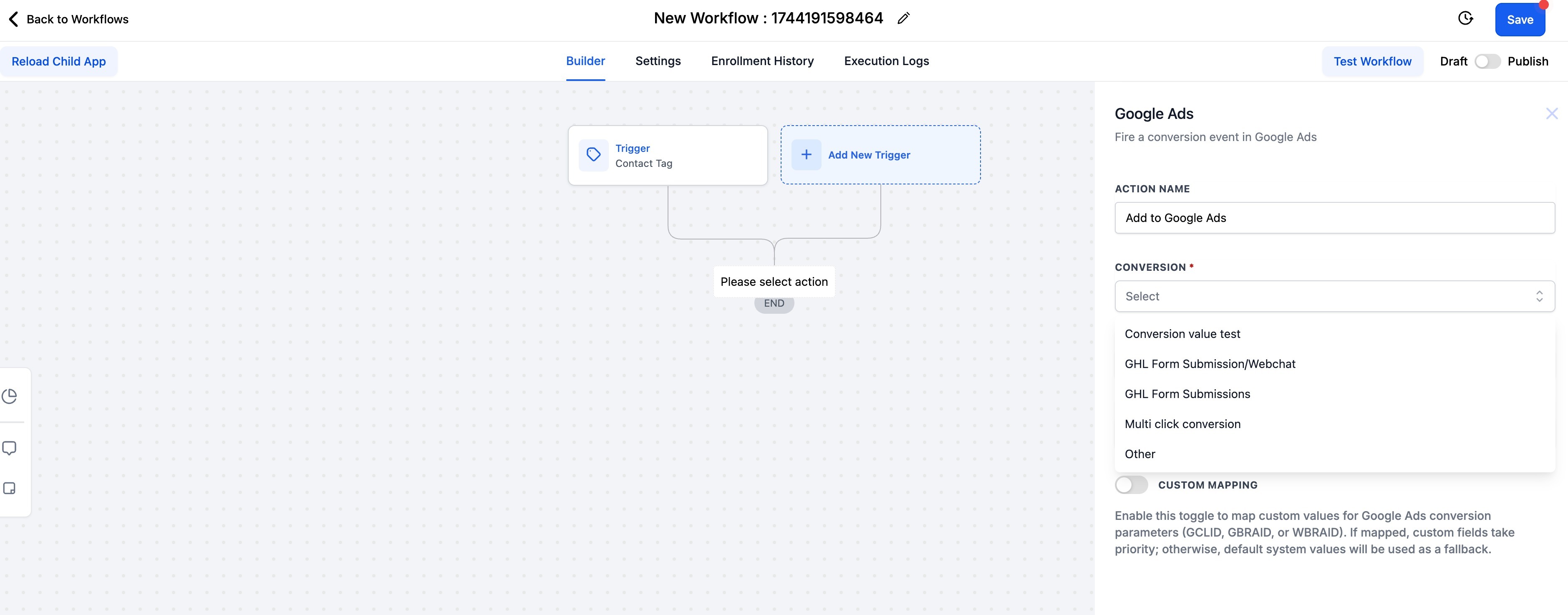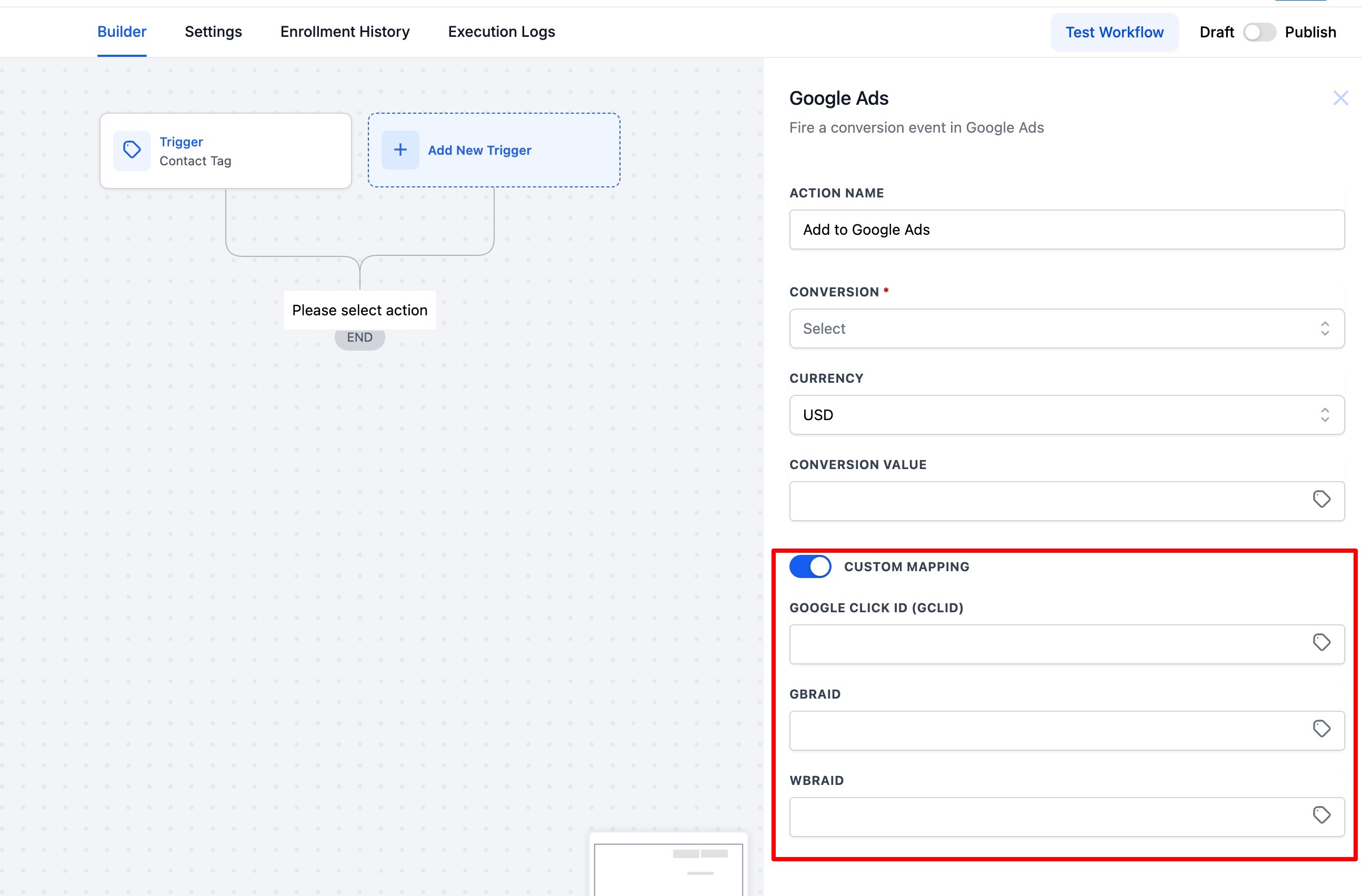 Every time you create a new campaign in Google, you will need to select the conversion action which you just created as your Google Adwords option in your new workflow action.It will take approximately 5 minutes once we receive one contact with UTM source and gclid, wbraid or gbraid to get the list populated in workflow trigger as well as in Google Adwords Conversion.