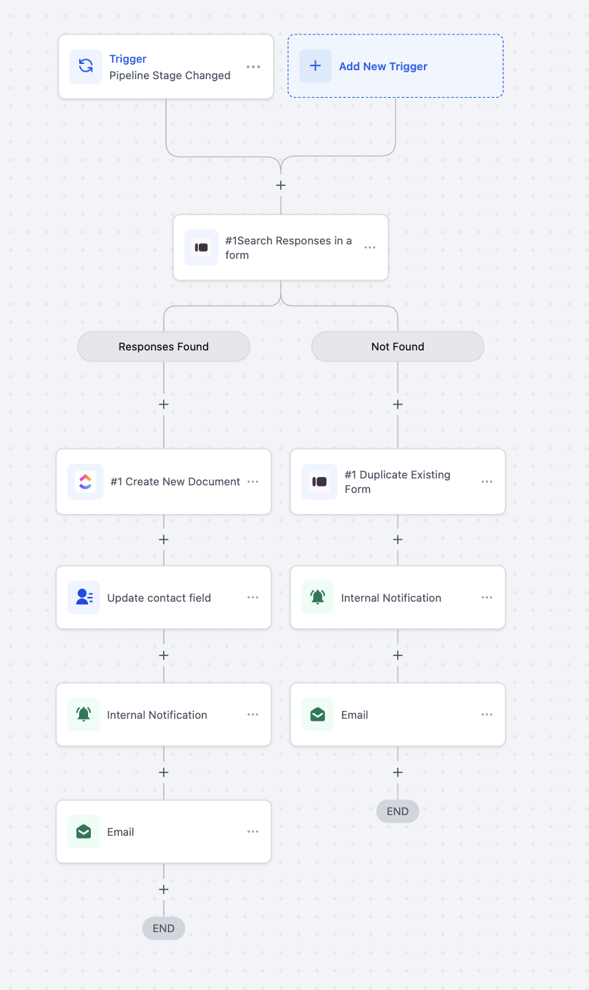 Goal: Automatically check for existing form responses when a deal’s pipeline stage changes, create or duplicate documents accordingly, and notify the team or contact based on the outcome.