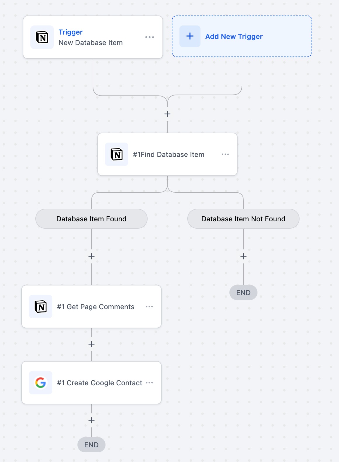 A new contact is created in Google Contacts whenever a new record is added to a Notion database. When a new record is added, the workflow checks if the record includes the comment "New user". If the comment is present, a new contact is automatically created in Google Contacts.