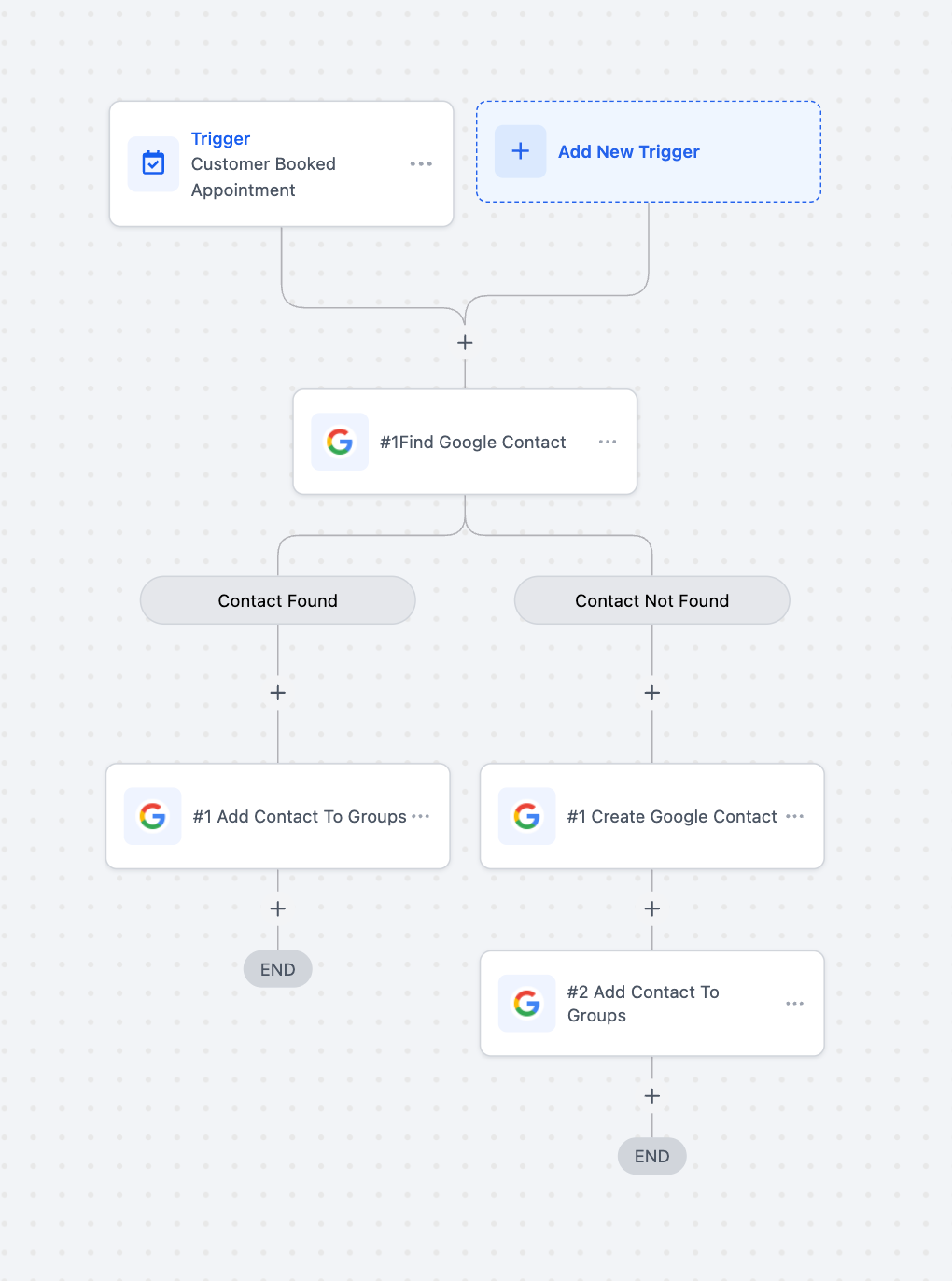 In the workflow builder, search for Google Contacts triggers or actions (e.g., “Find Contact,” “Create Contact”).