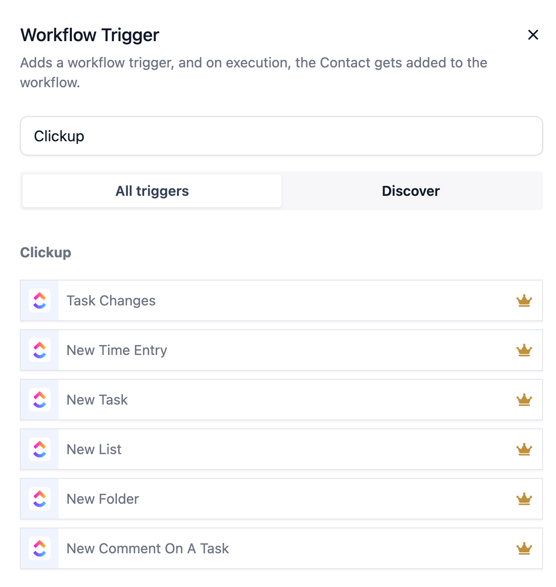 Open your workflow builder and search for any ClickUp actions or triggers you’d like to add.