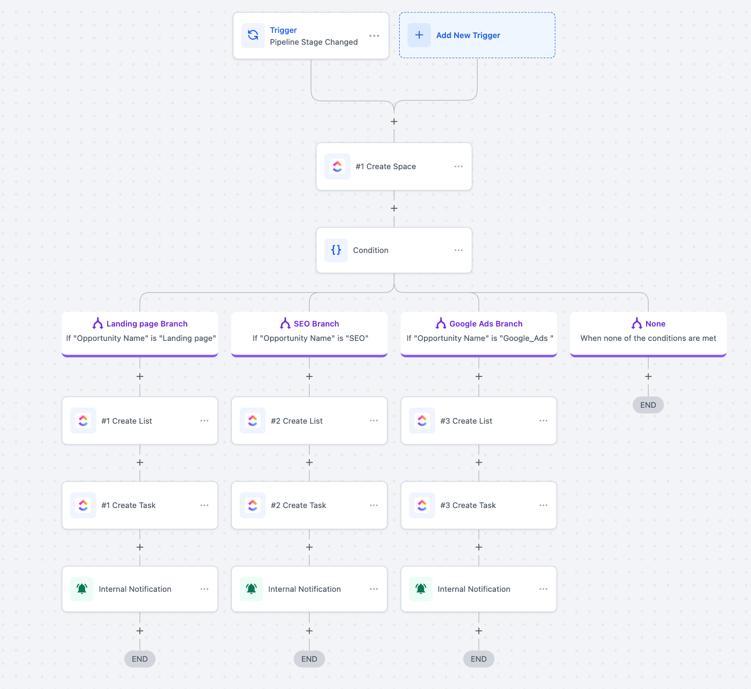 Goal: Automatically set up structured project workspaces in ClickUp whenever a deal moves to a new stage, with tasks and notifications tailored to the service type (Landing Page, SEO, or Google Ads).