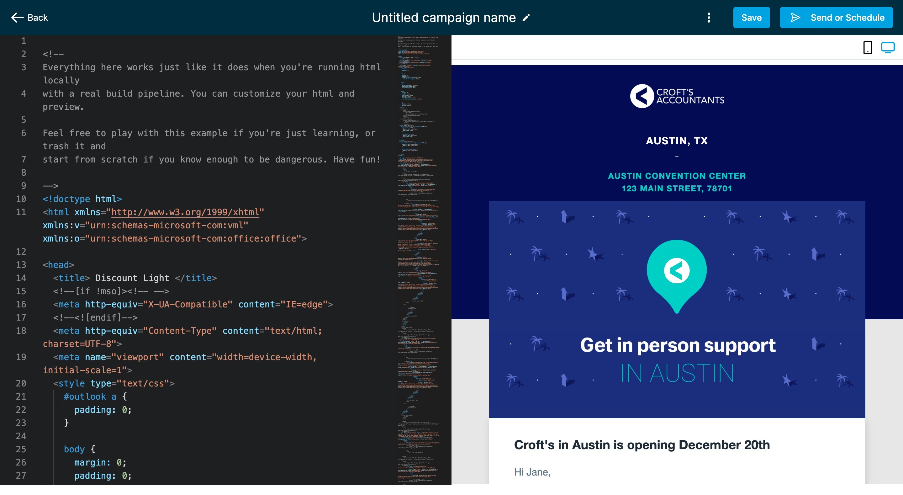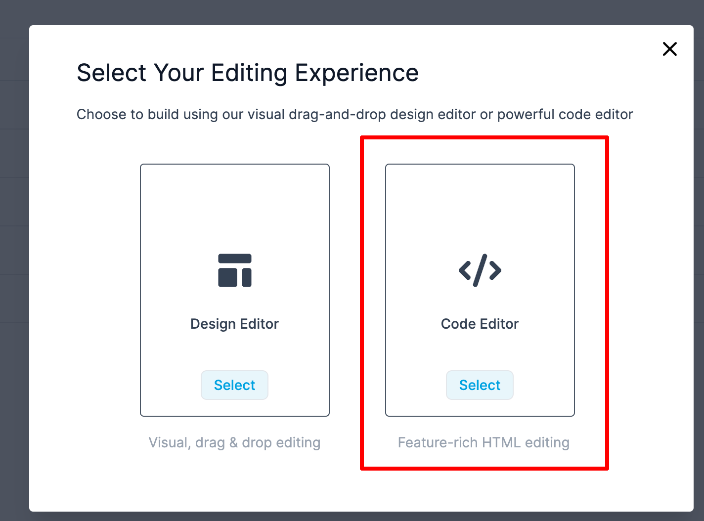 3. There will be a popup window with the option of Design Editor (drag and drop builder) and Code Editor (HTML builder). The user needs to select the Code Editor.