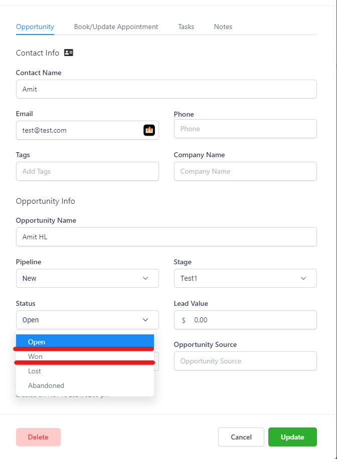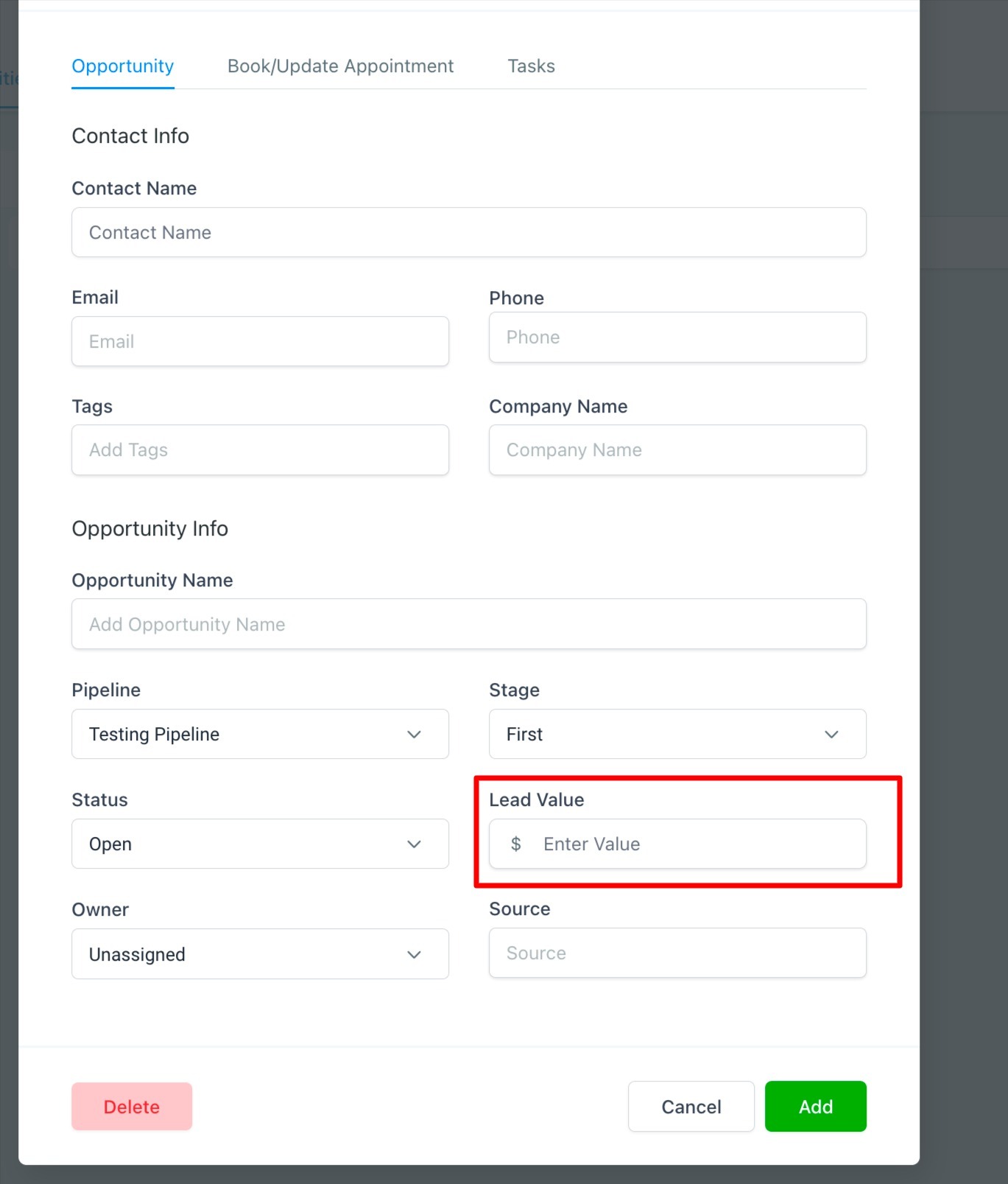 When adding a lead value only use numerical integers. There is no need to add a $ sign as its already accounted for in the field (See example below)