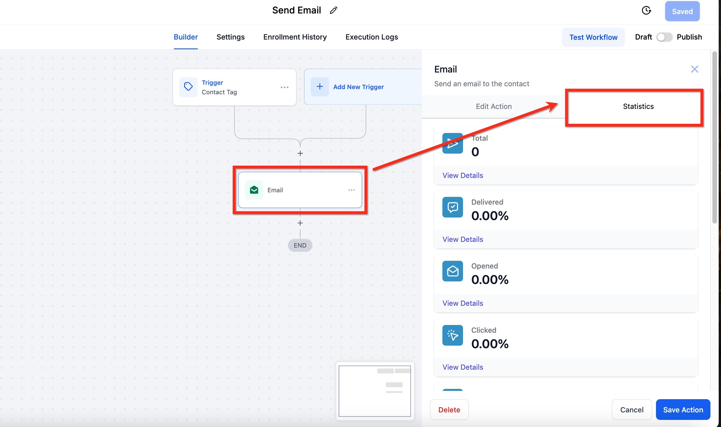 Monitor the performance of each automated email step directly inside your workflows. This view helps you understand how well your automated messages are reaching and engaging your audience. To view stats for a workflow email: