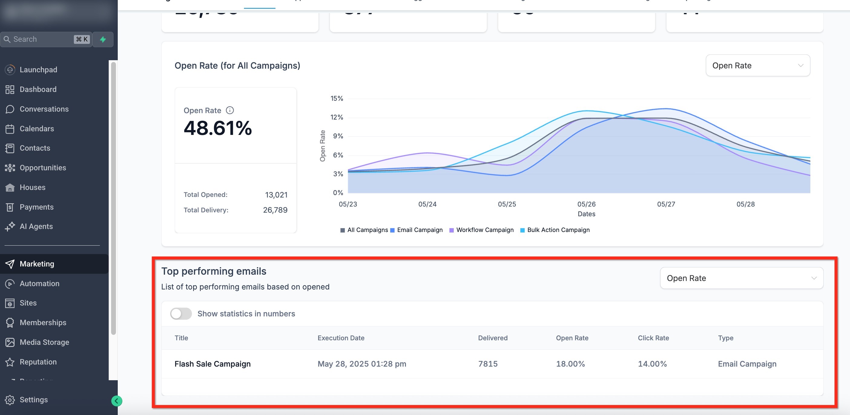 View a ranked list of your most successful emails based on open or click rates. This section helps you identify which emails or send times are resonating best with your audience.