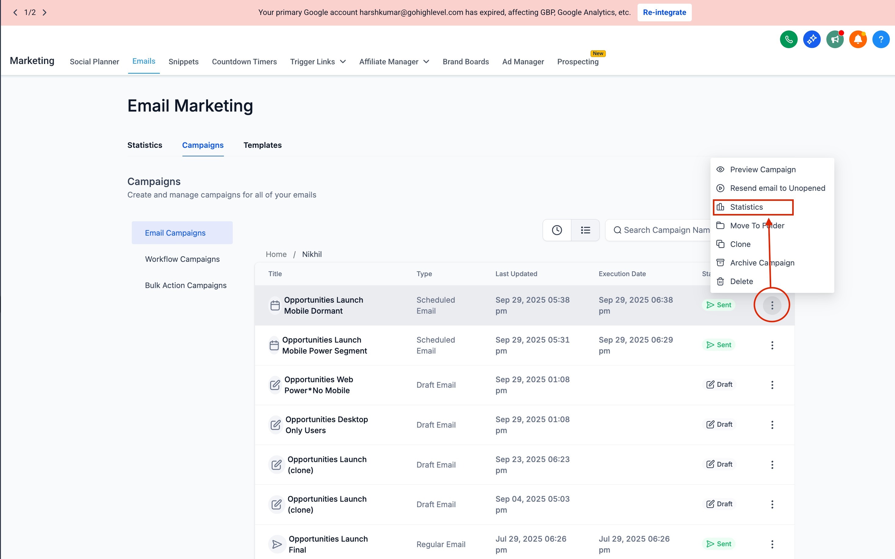 Click on the three-dot menu (⋮) next to the campaign name.