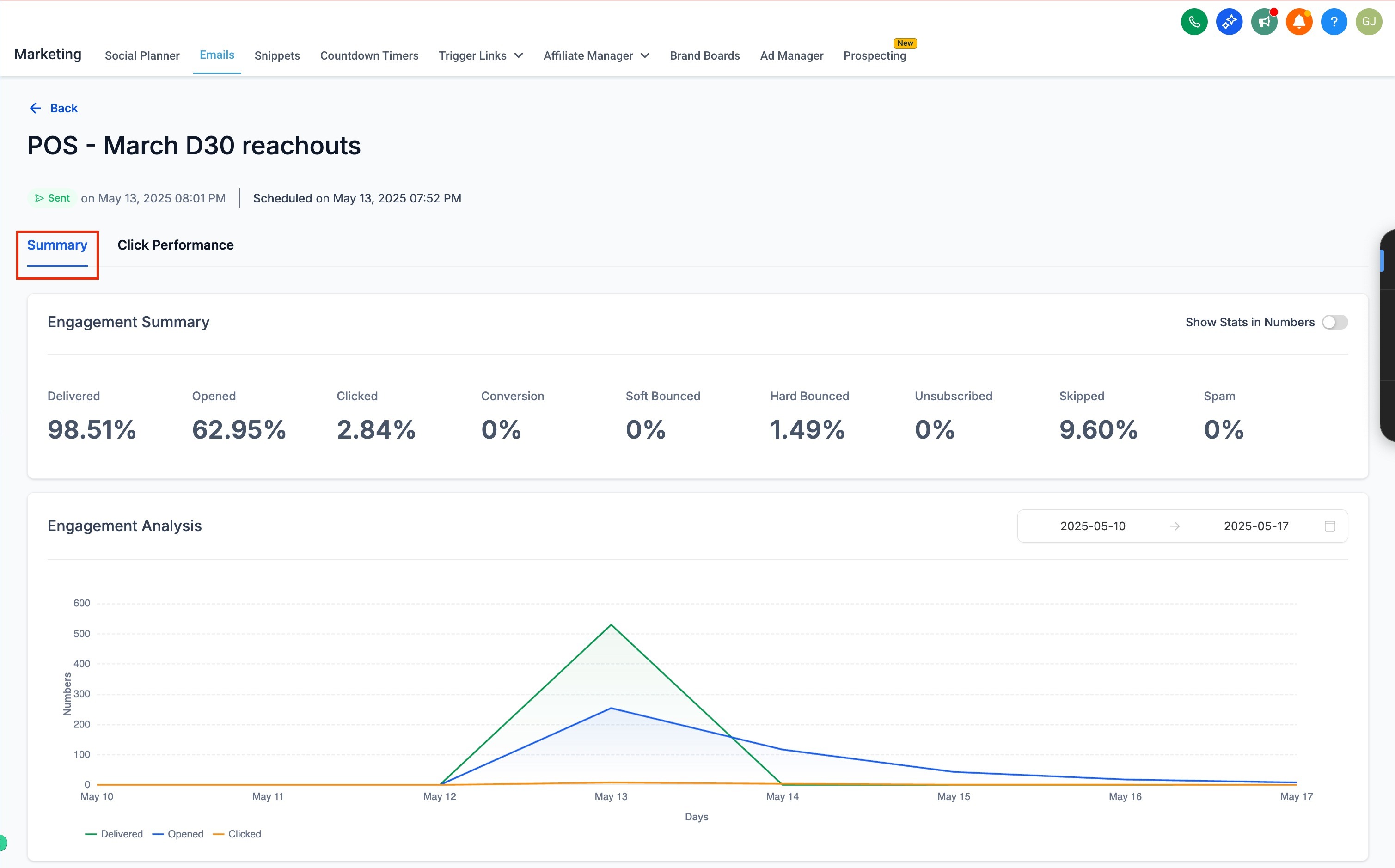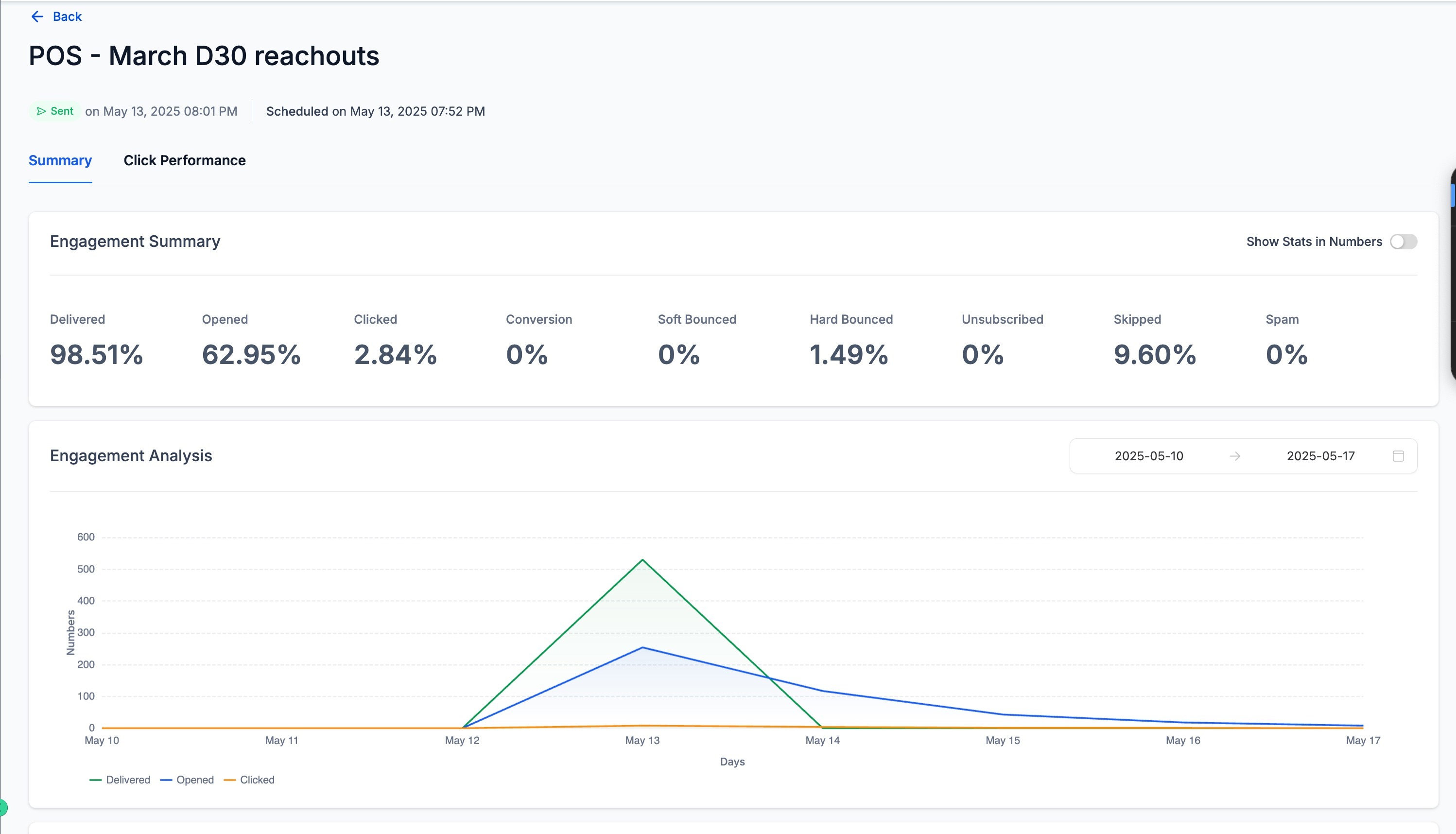 Below the summary, the Engagement Analysis graph visually displays your campaign’s key performance trends —