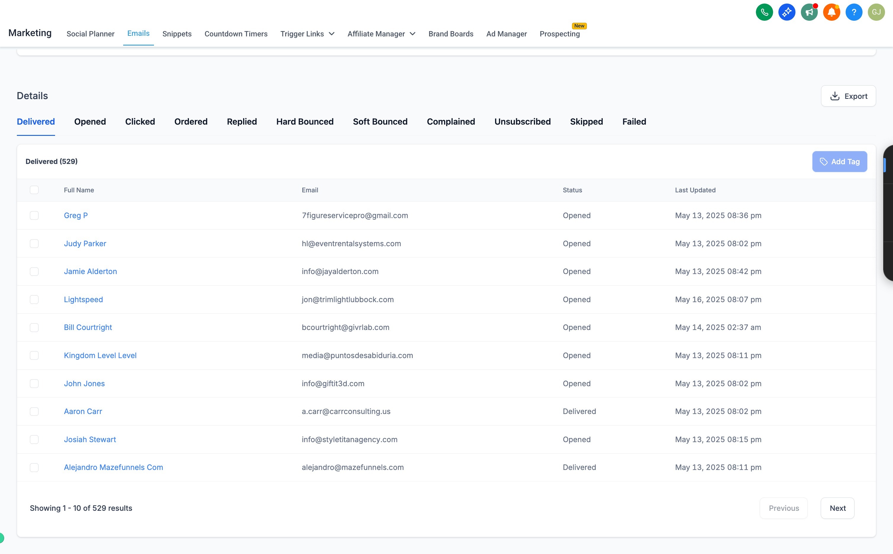 Yes, you can export data (like Delivered, Opened, Clicked, etc.) directly from the Details section as a CSV for deeper analysis or record-keeping.