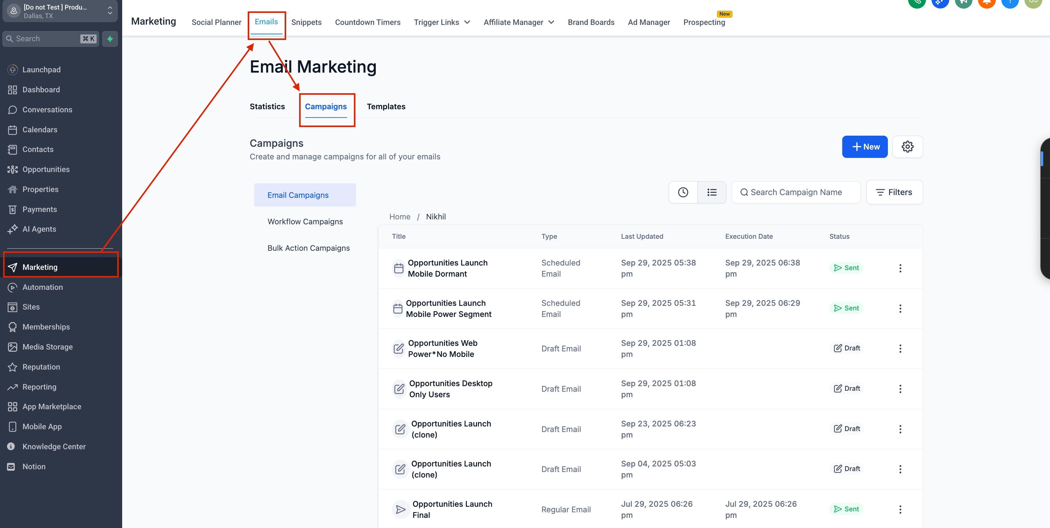 Navigate to Marketing → Emails from your dashboard.