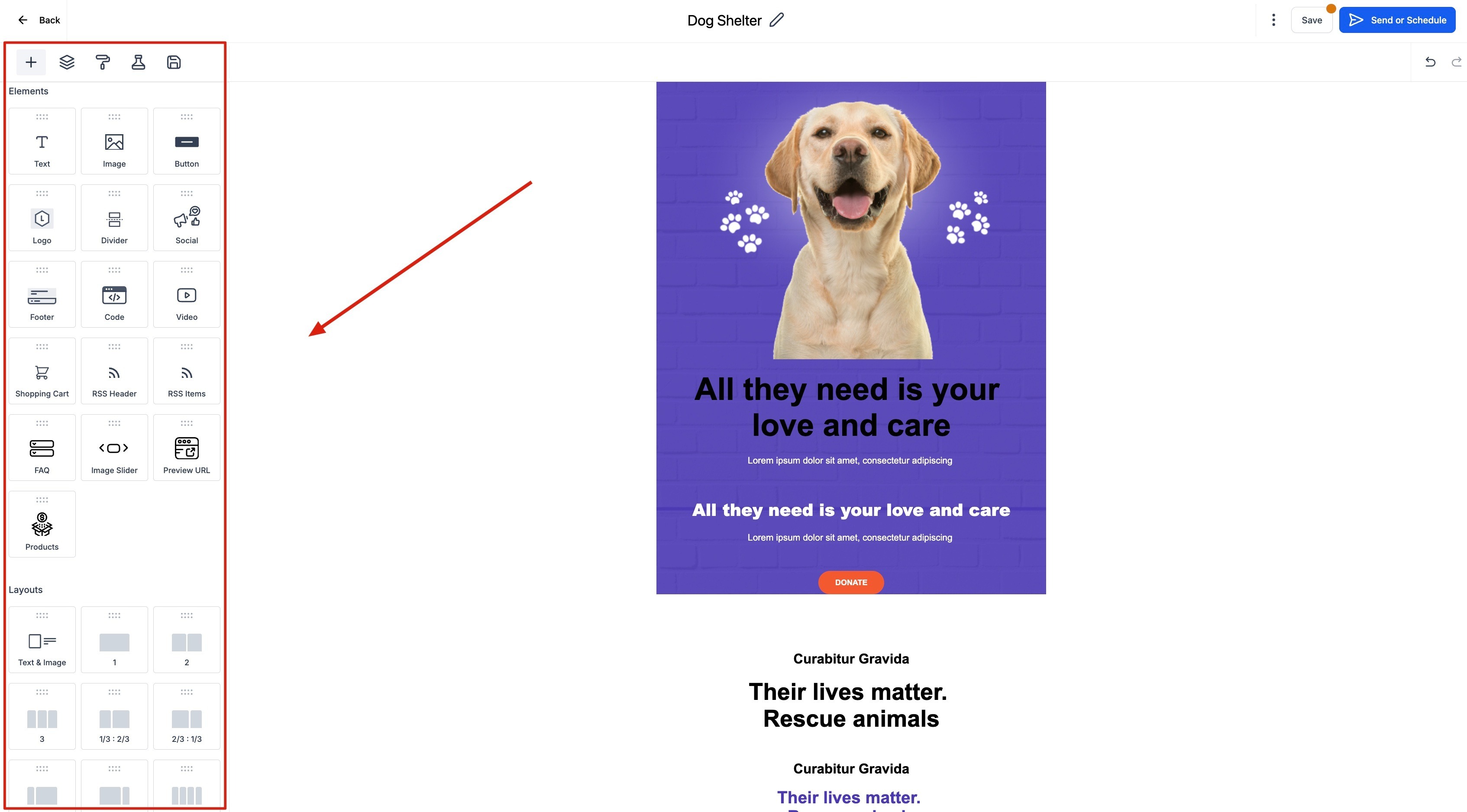 After you select a template, you'll design your campaign on top of the template layout. In Email Builder, you can duplicate, delete, and rearrange different types of element blocks quickly.