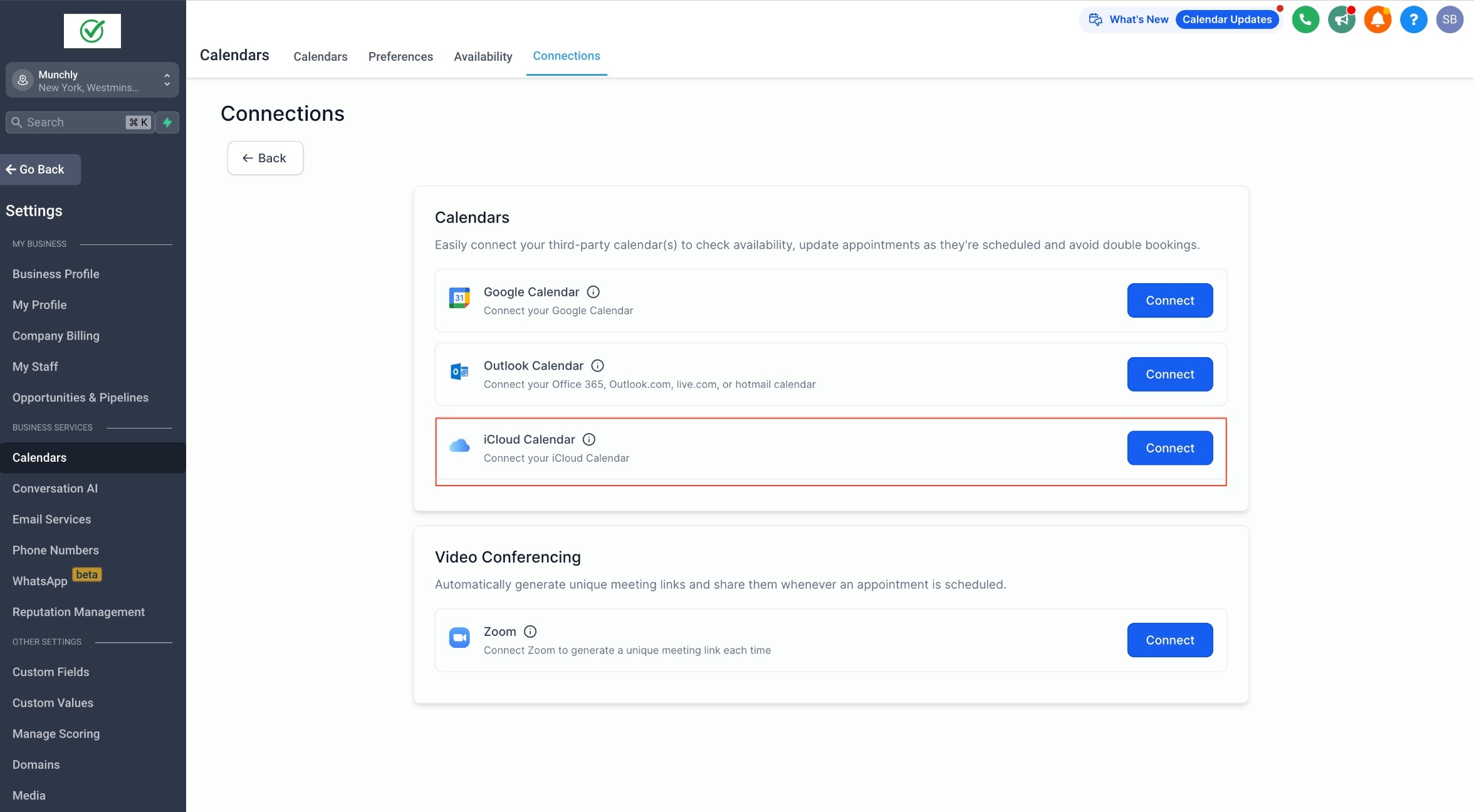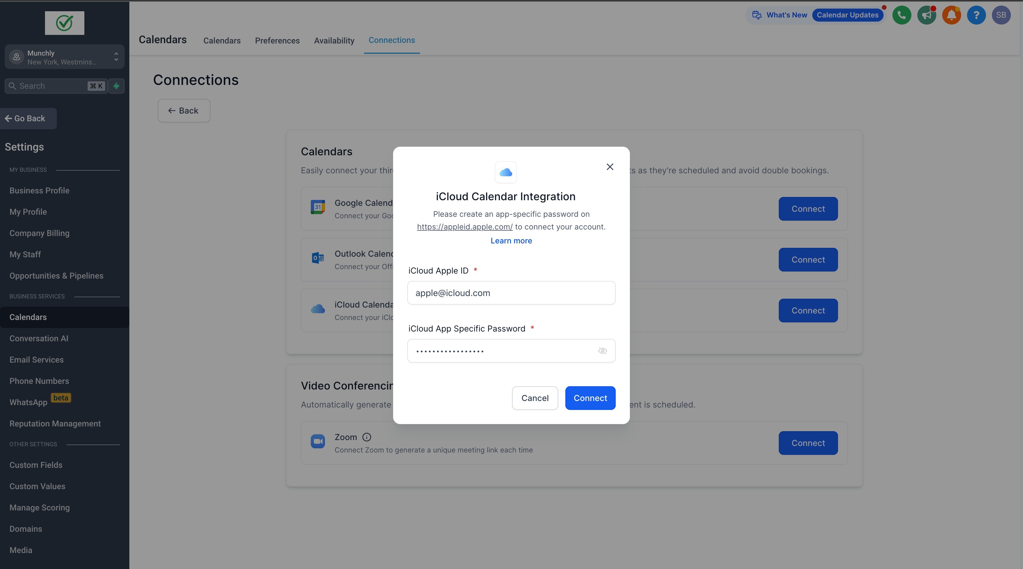 Connecting your iCloud Calendar helps you sync your bookings from iCloud Calendar to the system and vice versa. This ensures correct availability, prevents double bookings, and facilitates seamless scheduling and booking management.