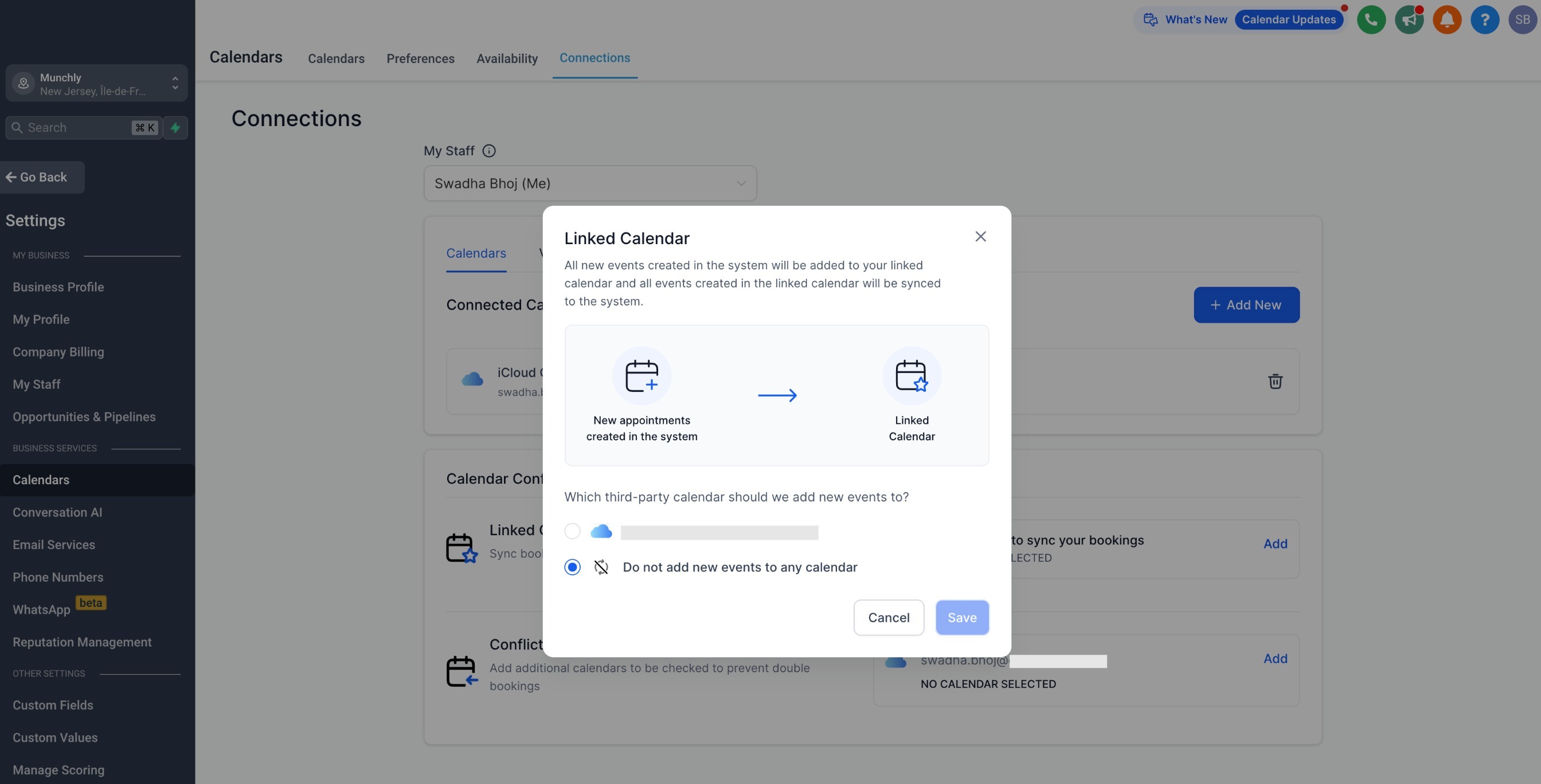 All new events created in the system will be added to your linked calendar. For example, any new event created in the system will sync to your linked calendar, allowing you to view it directly on this third-party calendar (e.g., iCloud).