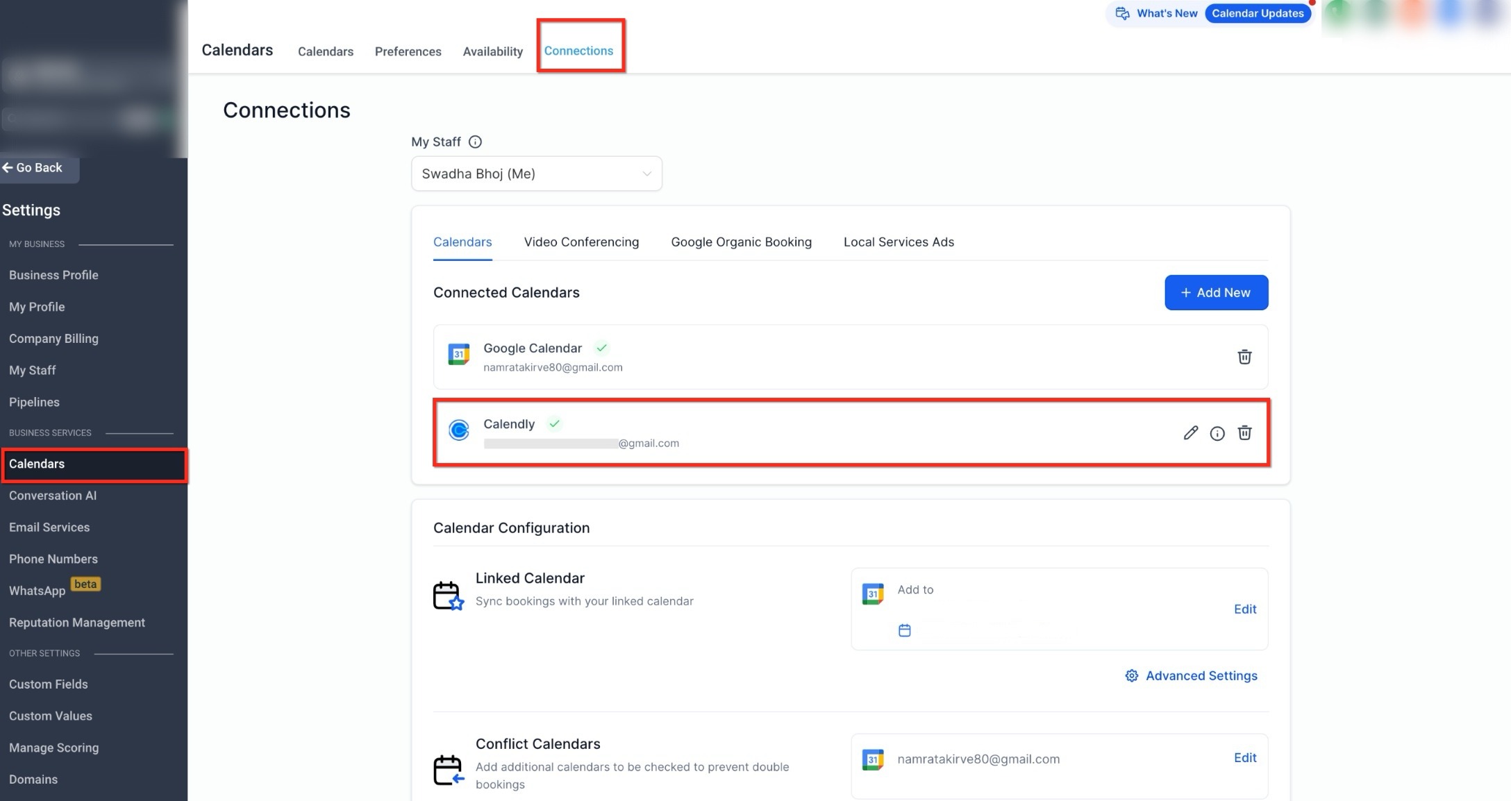 This view highlights Calendly as one of the available calendar connection options.