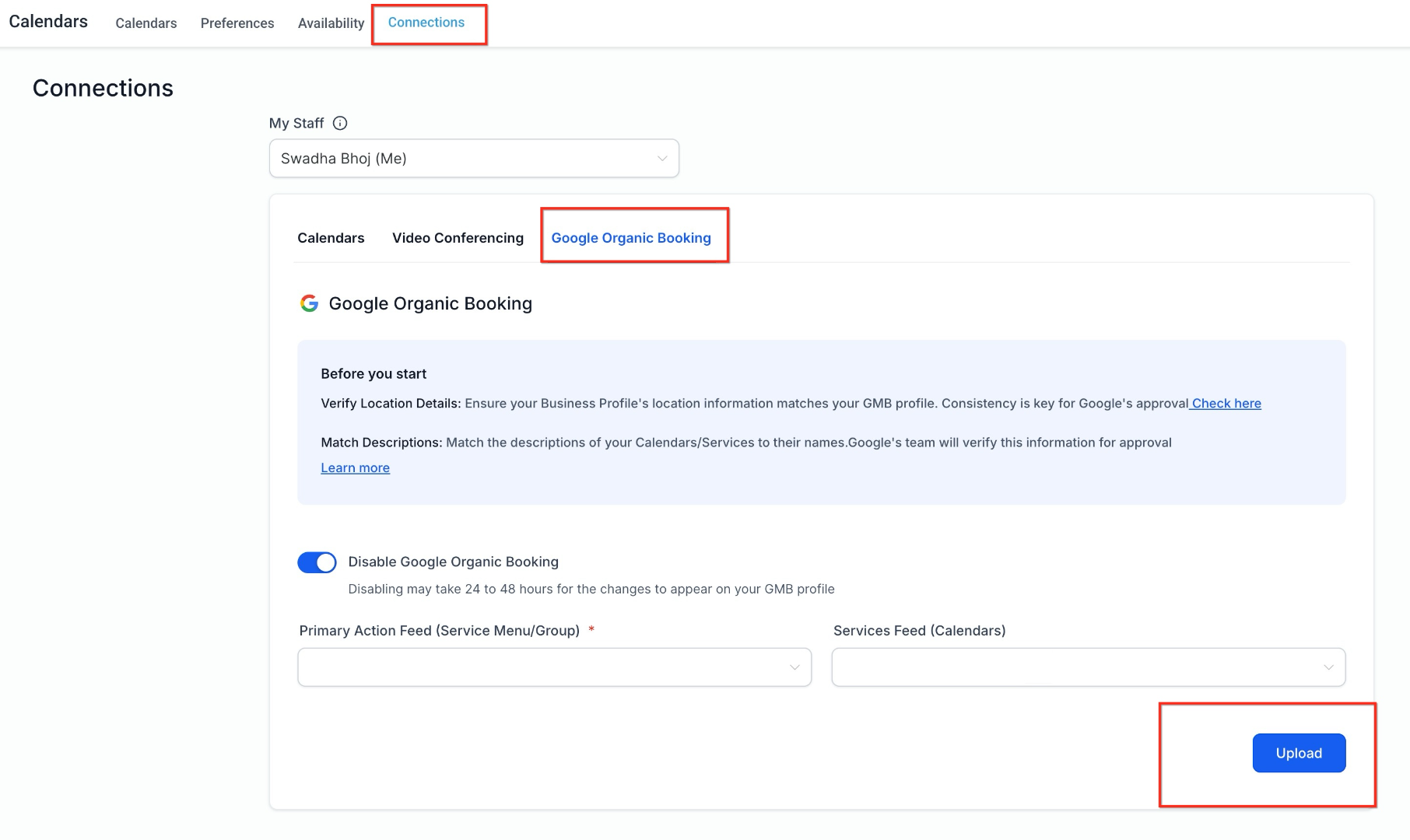 This screen shows where Organic Booking is managed inside calendar connection settings. From here, booking feeds are configured and uploaded.