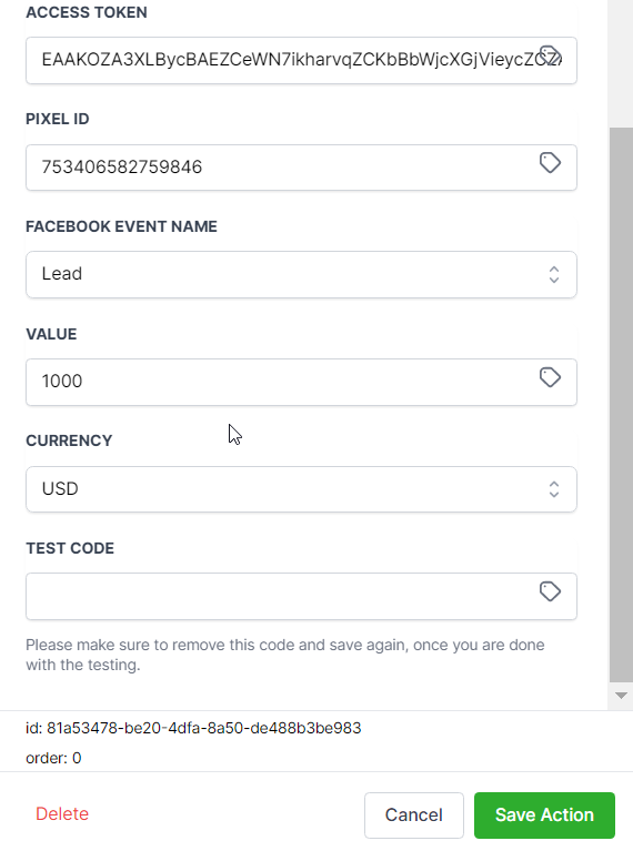 - Paste the Pixel ID in the Pixel ID field in your Workflow's FB Conversion API Action.