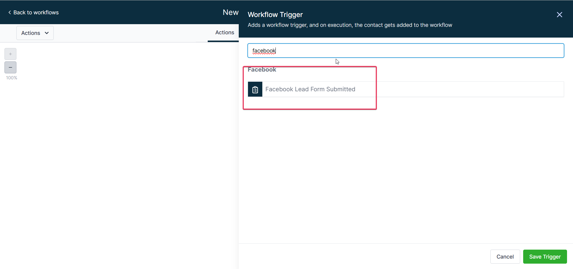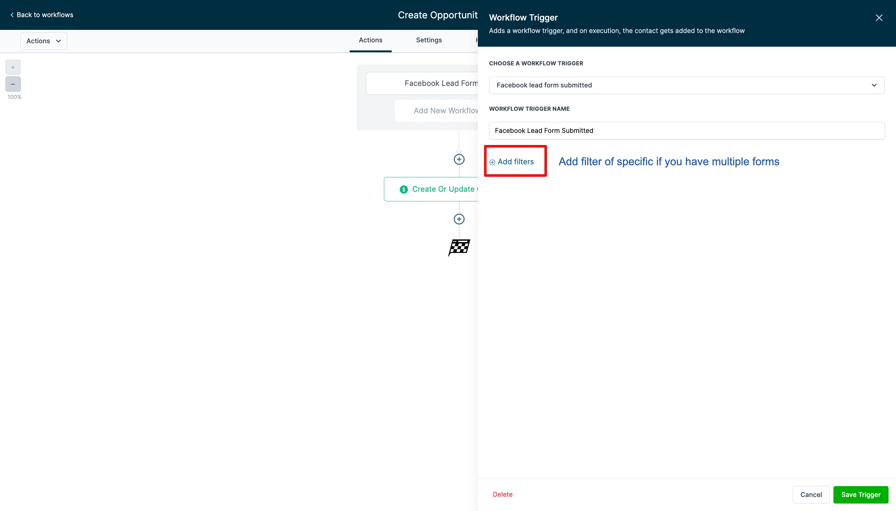 You can add filters to choose which specific Facebook Lead Ad form to get the Workflow to be triggered by submissions to that form only: