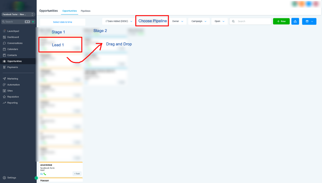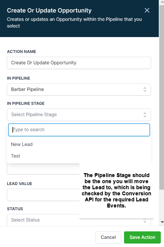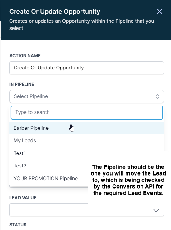 Lead Events - The LeadConnector CRM sends the events with how the Lead moves across the pipeline stages. For example, a Business creates a pipeline name Lead Generation. The leads are moving across the pipeline stages, from new leads to booked or abandoned ones. With Lead events, LeadConnector CRM sends the data to Facebook Conversion API - with CRM being the data source.