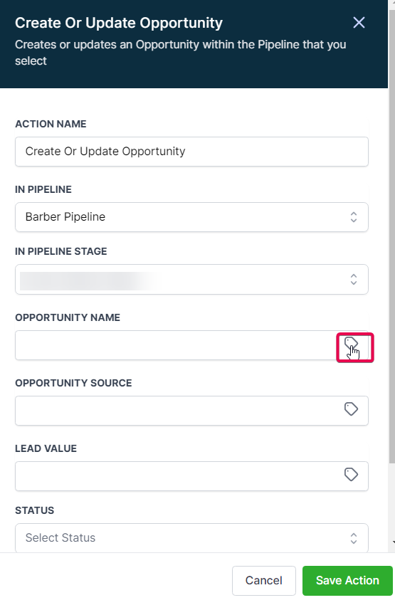 - Fill in the Stage Name; it should accurately represent your Pipeline and Pipeline Stage name for better reporting. Select it using the tag icon at the end to add the custom value of the opportunity pipeline and stages. Save the Action, save and Publish the Workflow