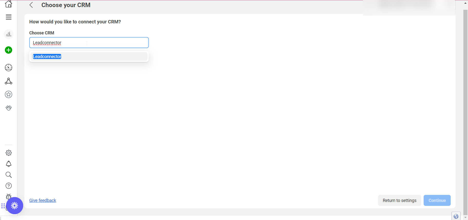 Hit Continue in front of Choose Your CRM - Search for LeadConnector in the search bar, and choose LeadConnector from the dropdown: