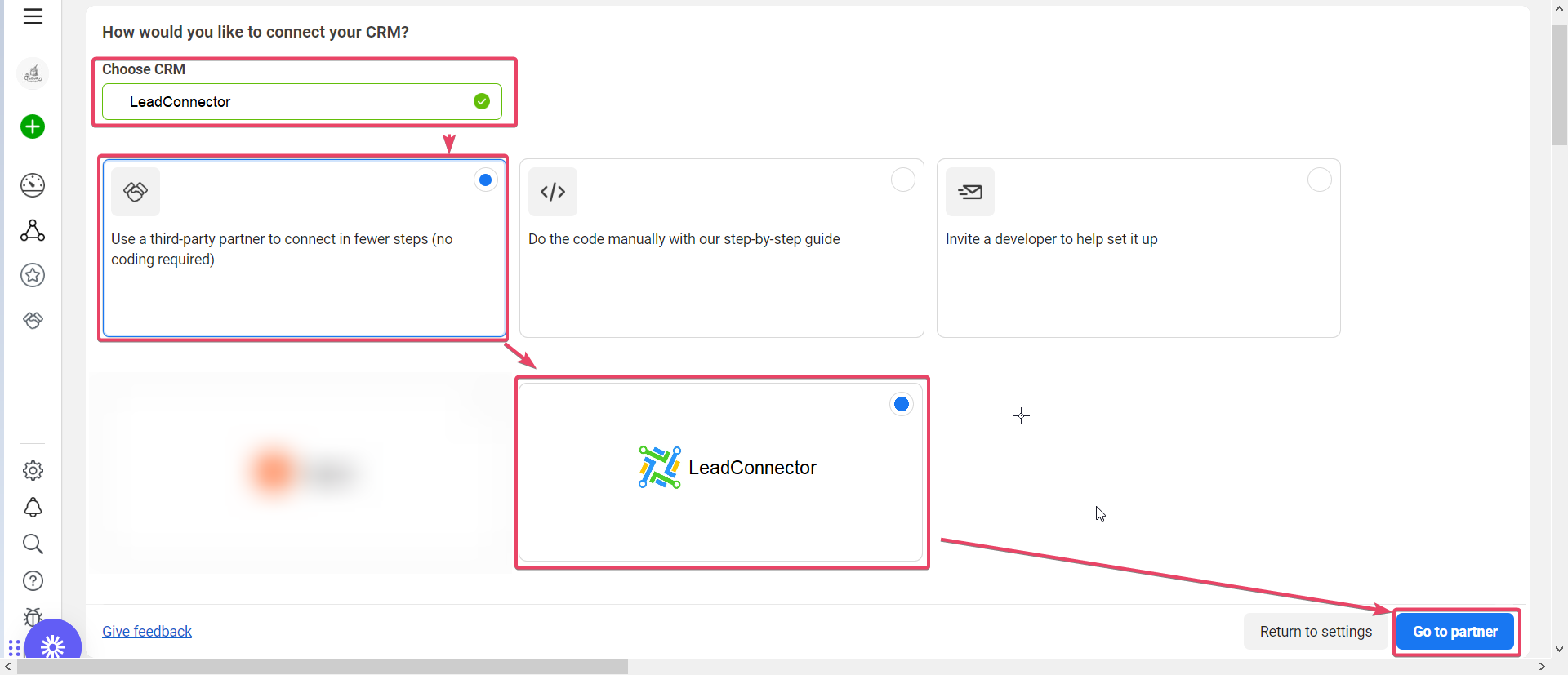 - Select Use a third-party partner to connect in a few steps (no coding required), then choose LeadConnector. Then click on Go to Partner to proceed.
