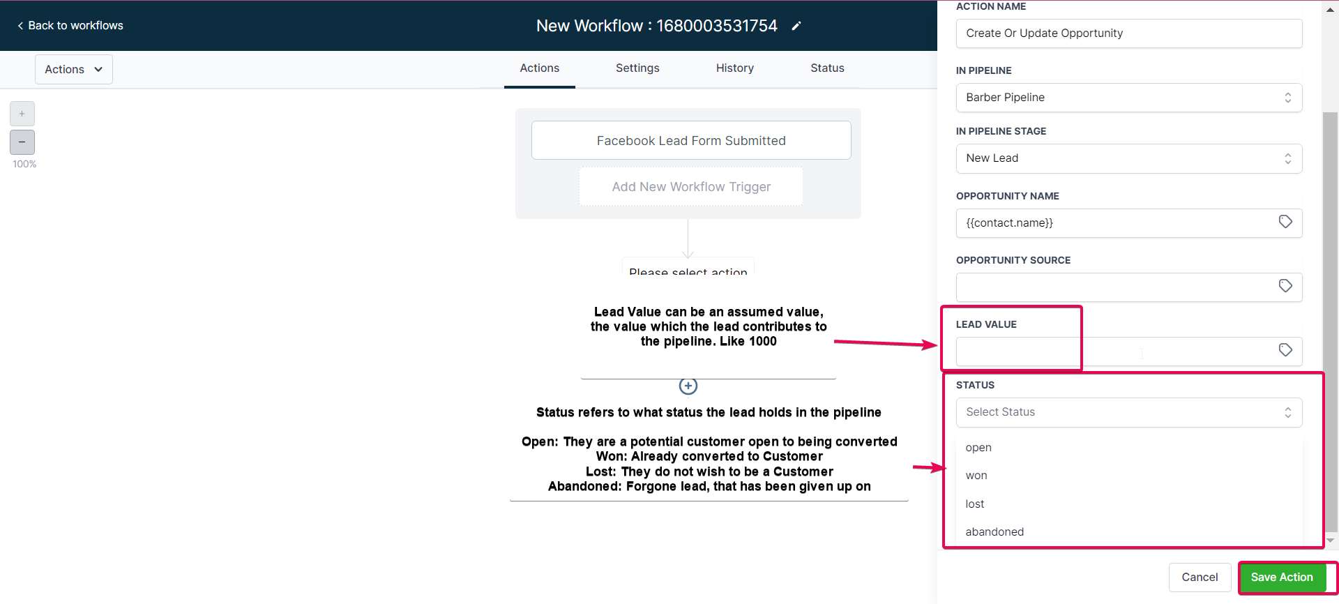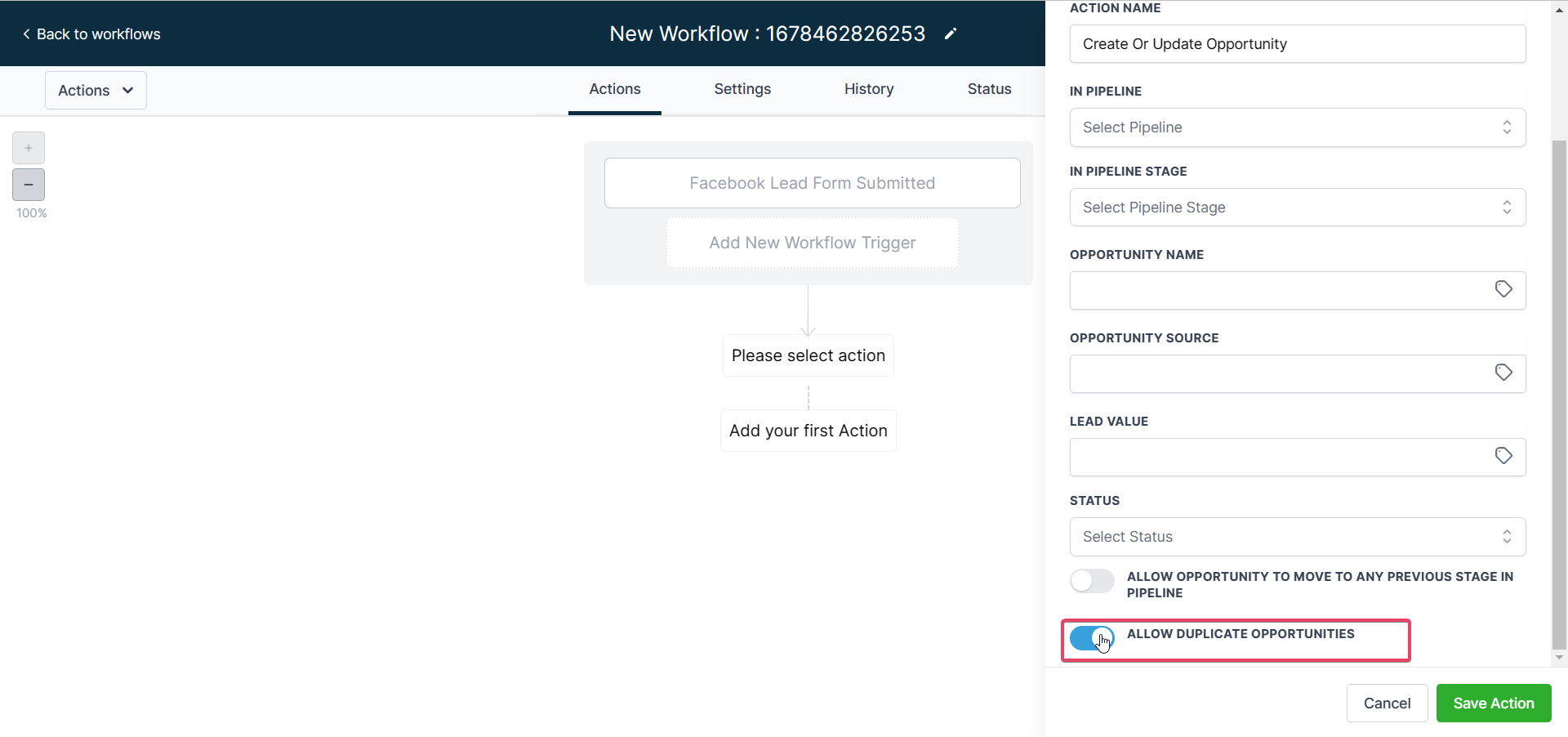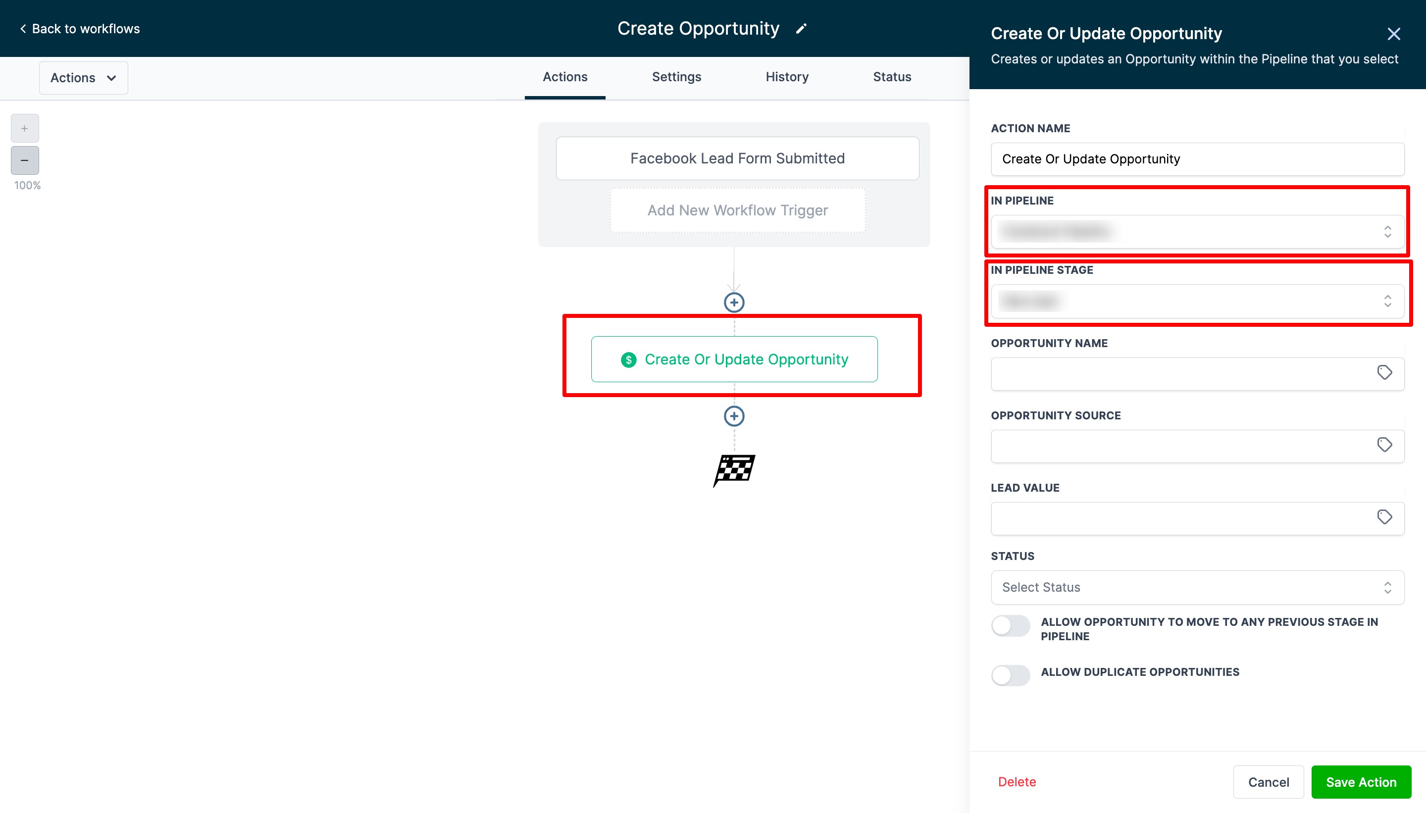 The first workflow focuses on generating leads and adding them to the correct pipeline with an Create/Update Opportunity Action. Once a lead is captured, it is important to ensure that it is properly tagged and categorized in the correct Pipeline and Stage so that it can be effectively managed and tracked as it moves through your sales funnel.