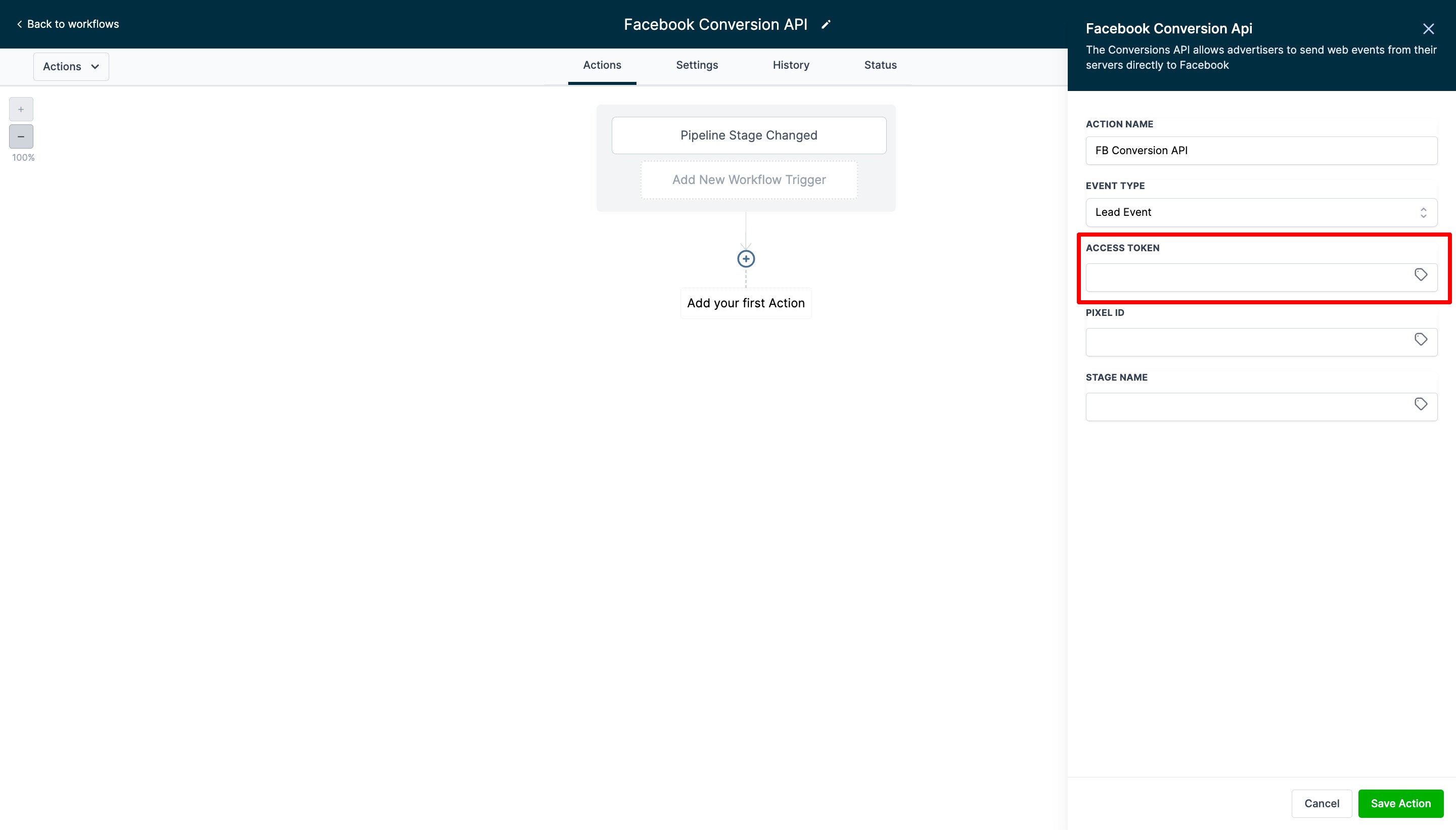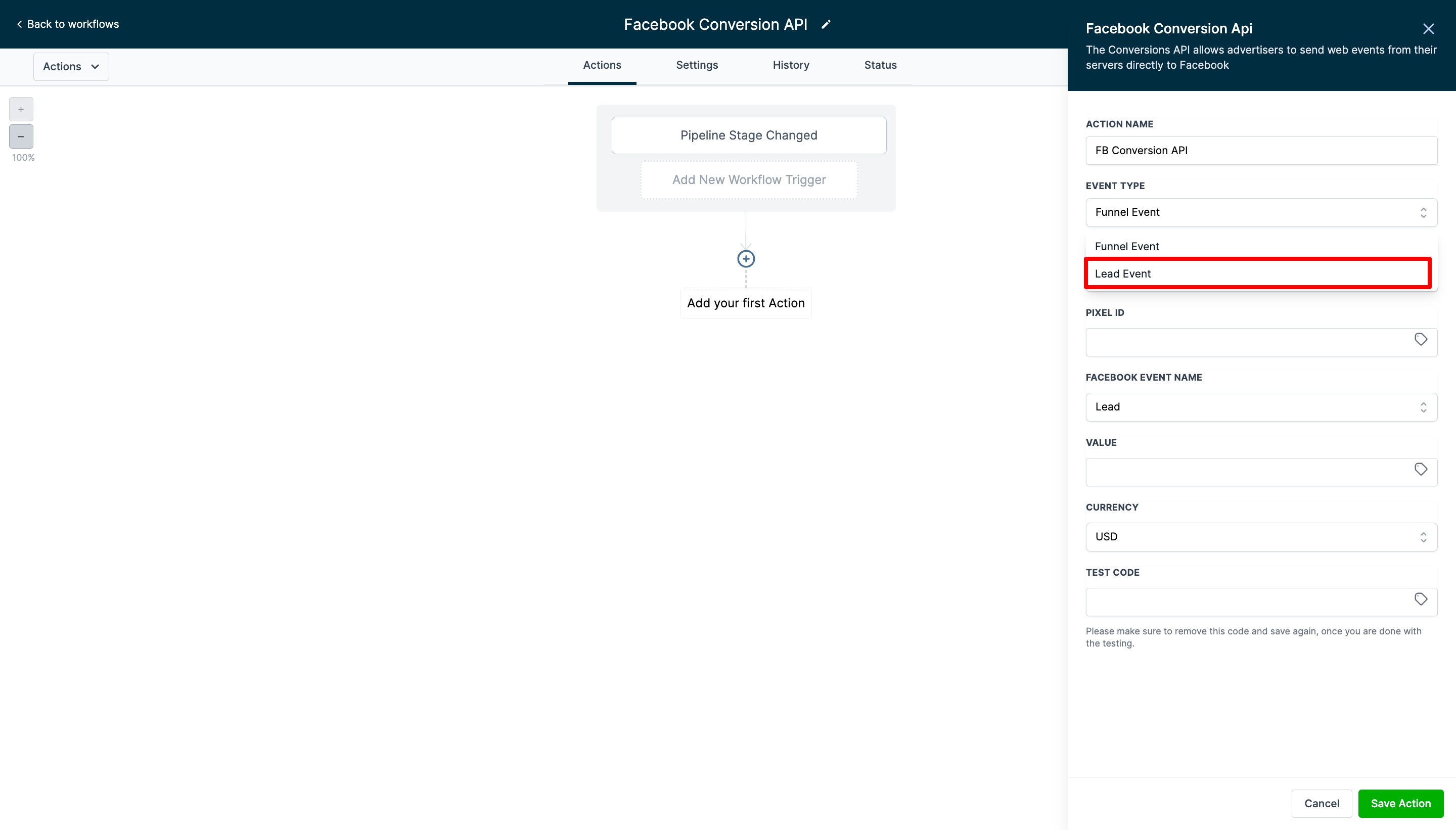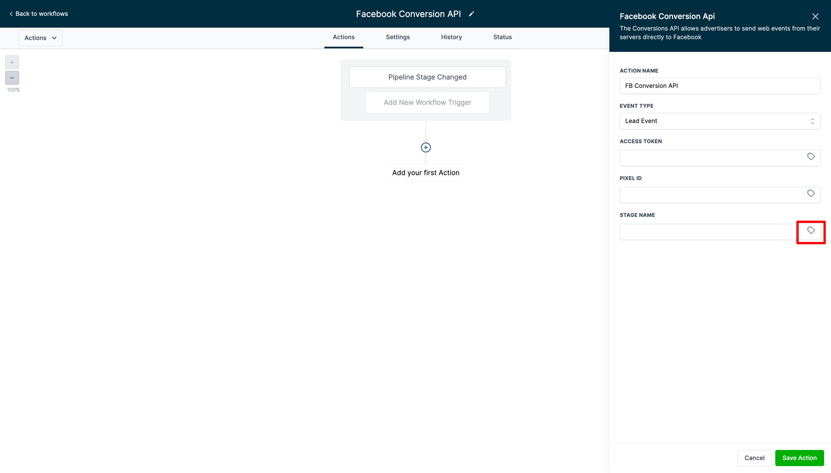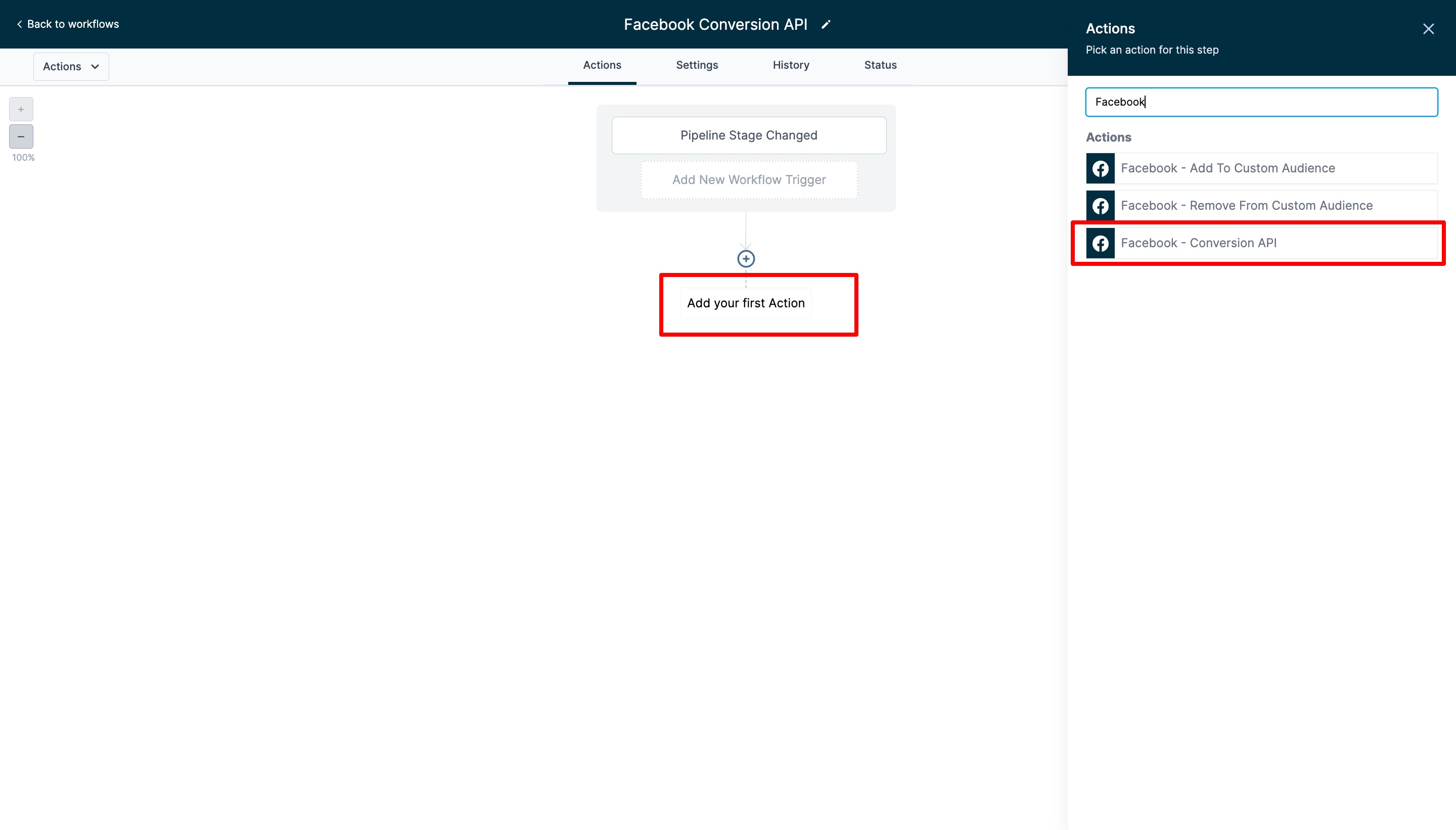 Create another workflow. Add the Pipeline Stage Change trigger and a Facebook Conversion API action.