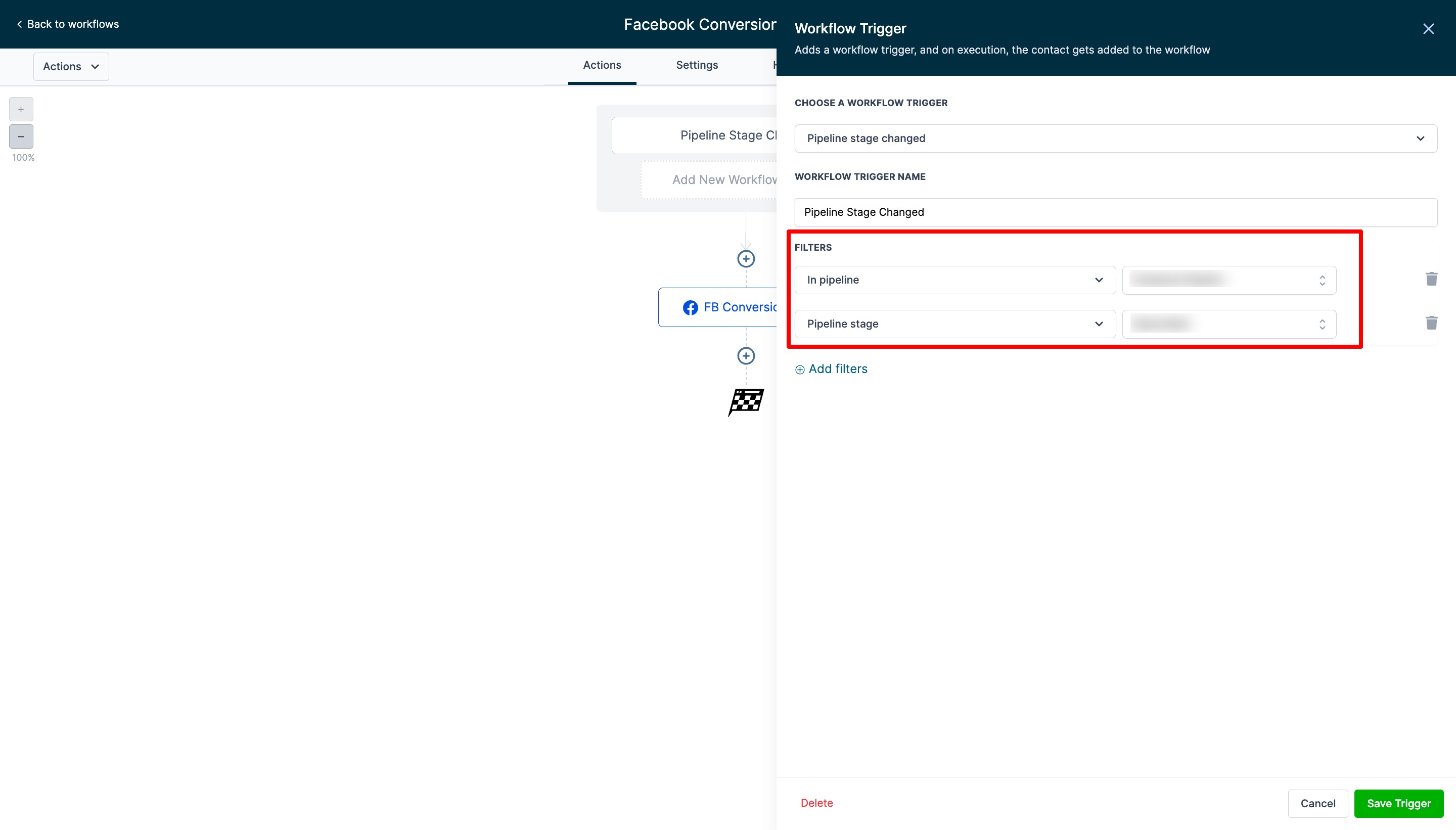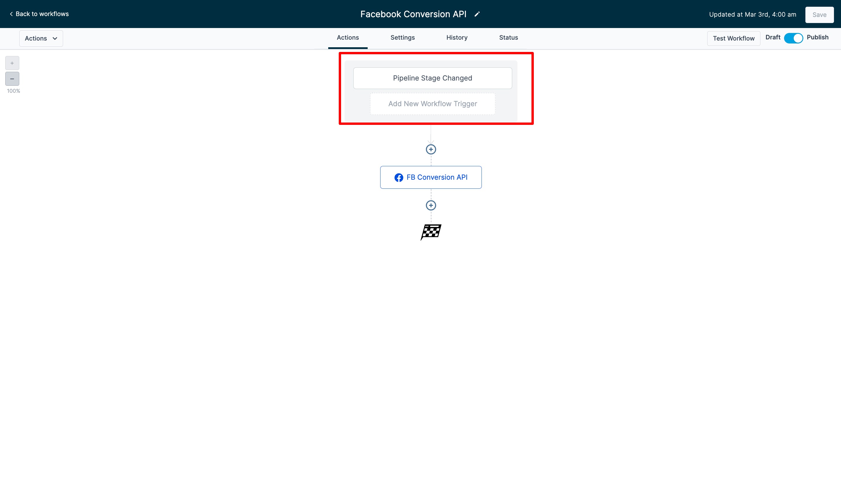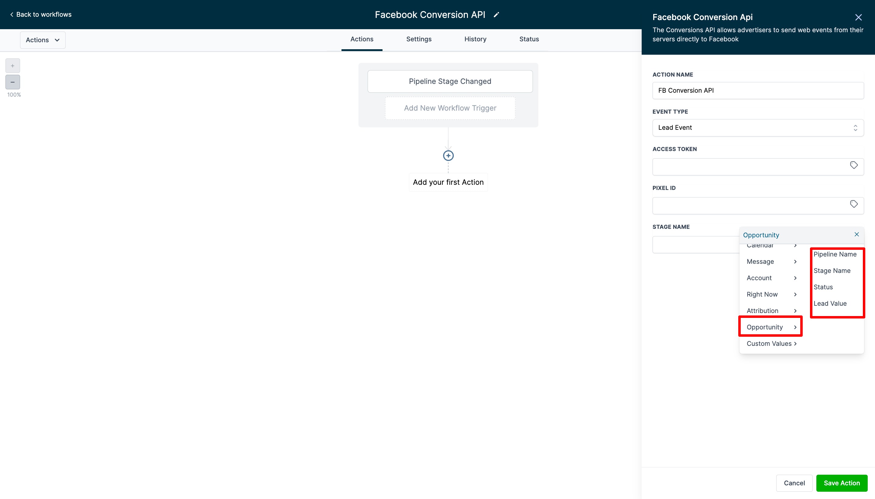 The second workflow focuses on triggering events for Facebook conversion leads. The goal of this workflow is to get fired off by a lead being moved to a specific pipeline stage and then a Facebook Conversions API workflow action pushing them to FB CAPI.