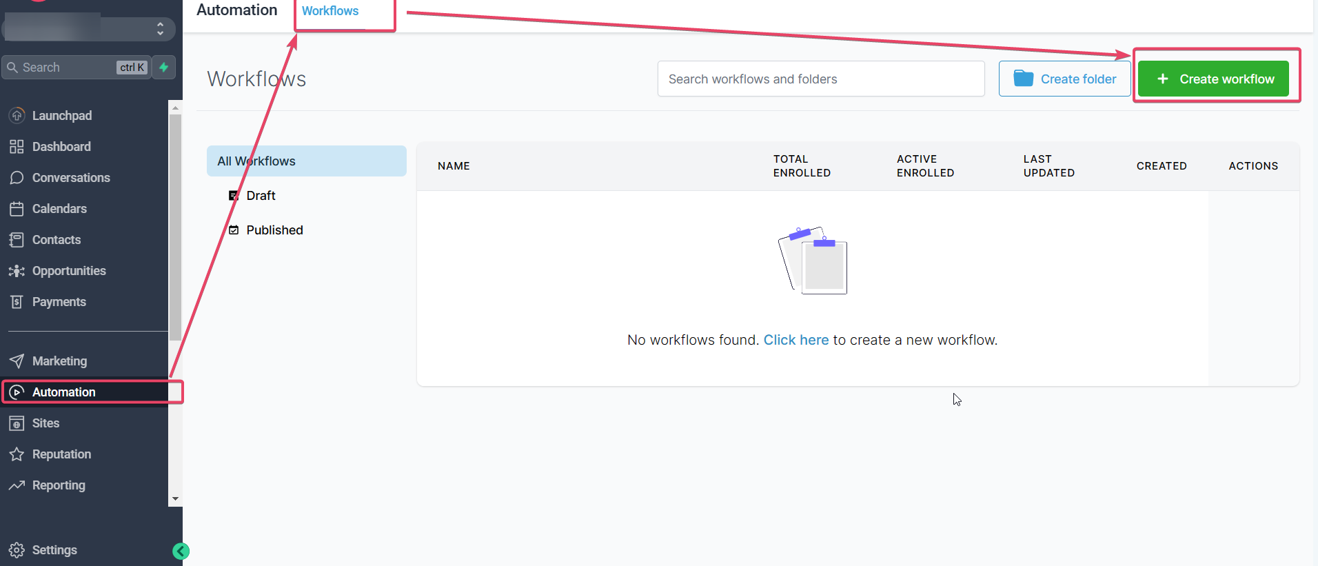 Once the FB page is integrated correctly in sub-account settings, go to your Automations> Workflows >Create a new Workflow.