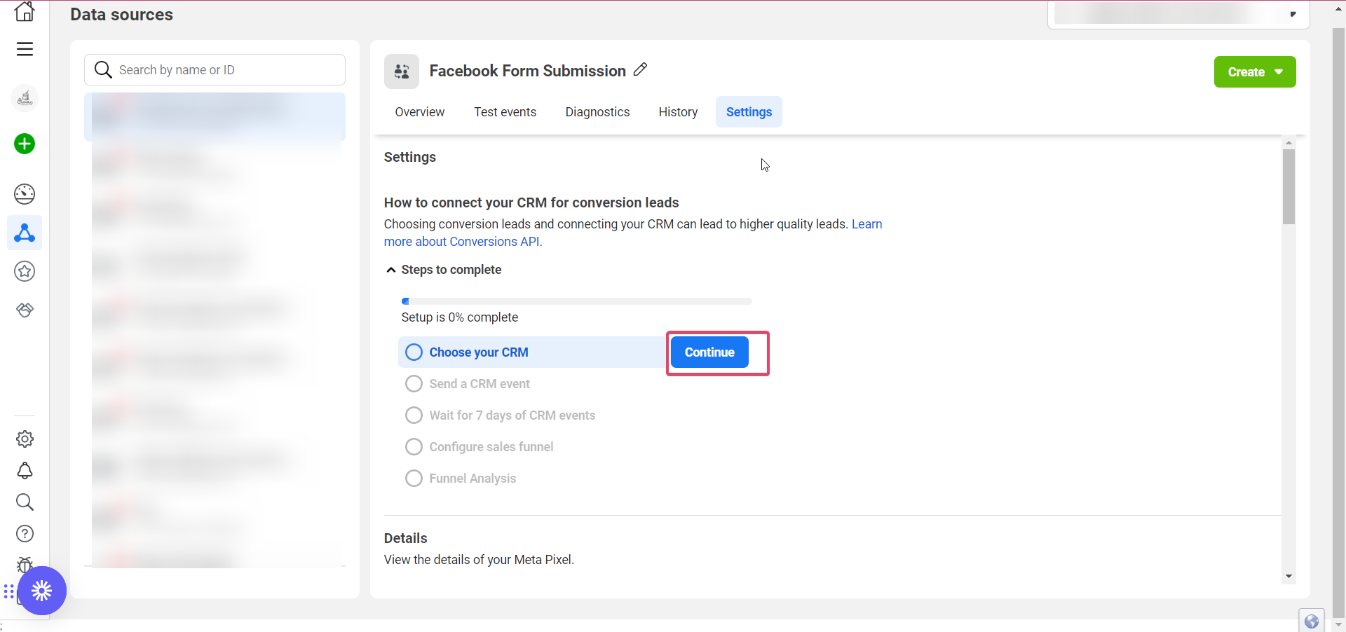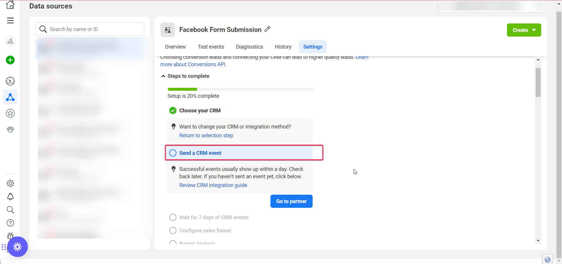 11. Return to the “Settings” tab in Events Manager to track the progress of the Conversion Leads integration.