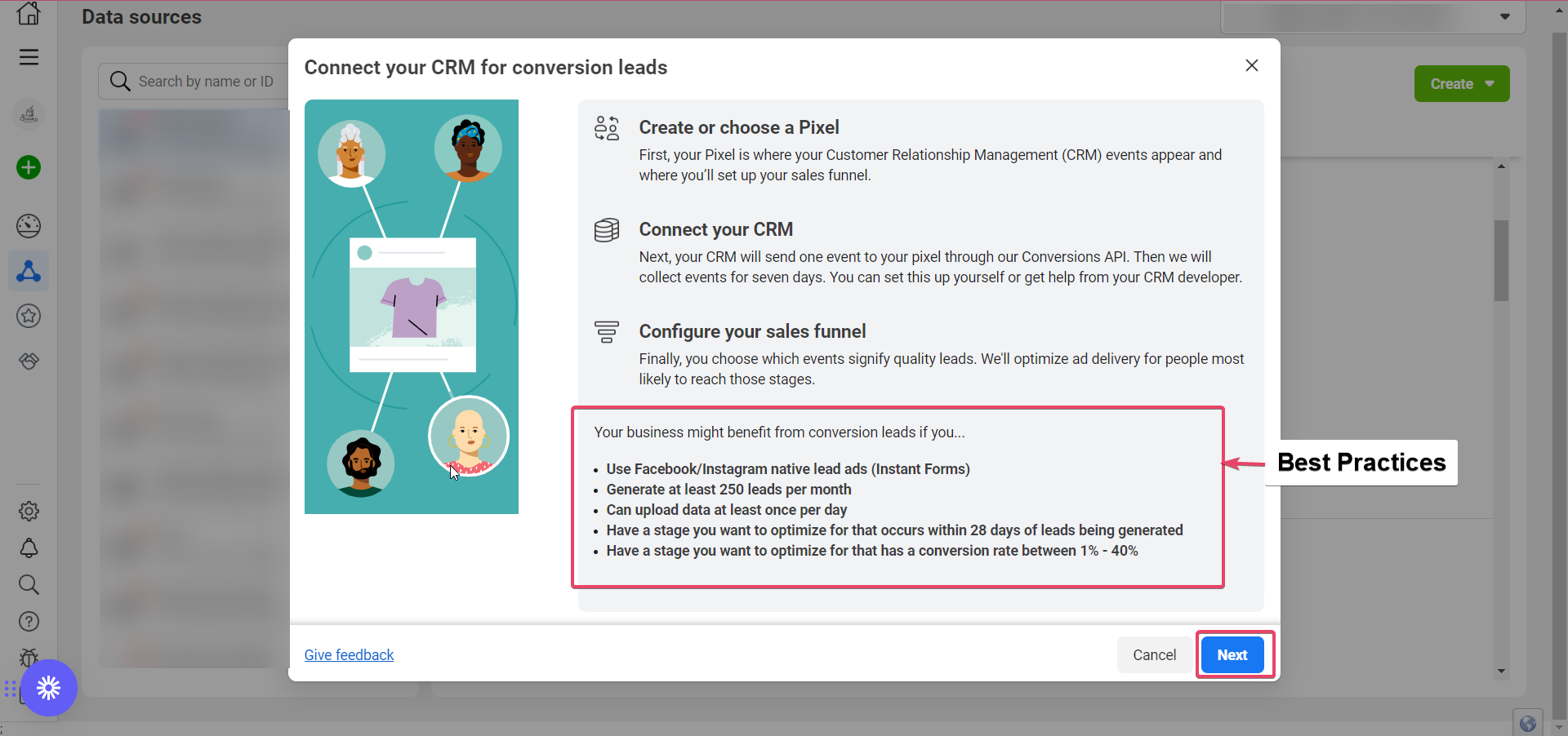 - It will show you a popup with Best Practices and a button to click Next. The Best Practices are Facebook suggestions on how to utilize this capability best. Click on Next to proceed.