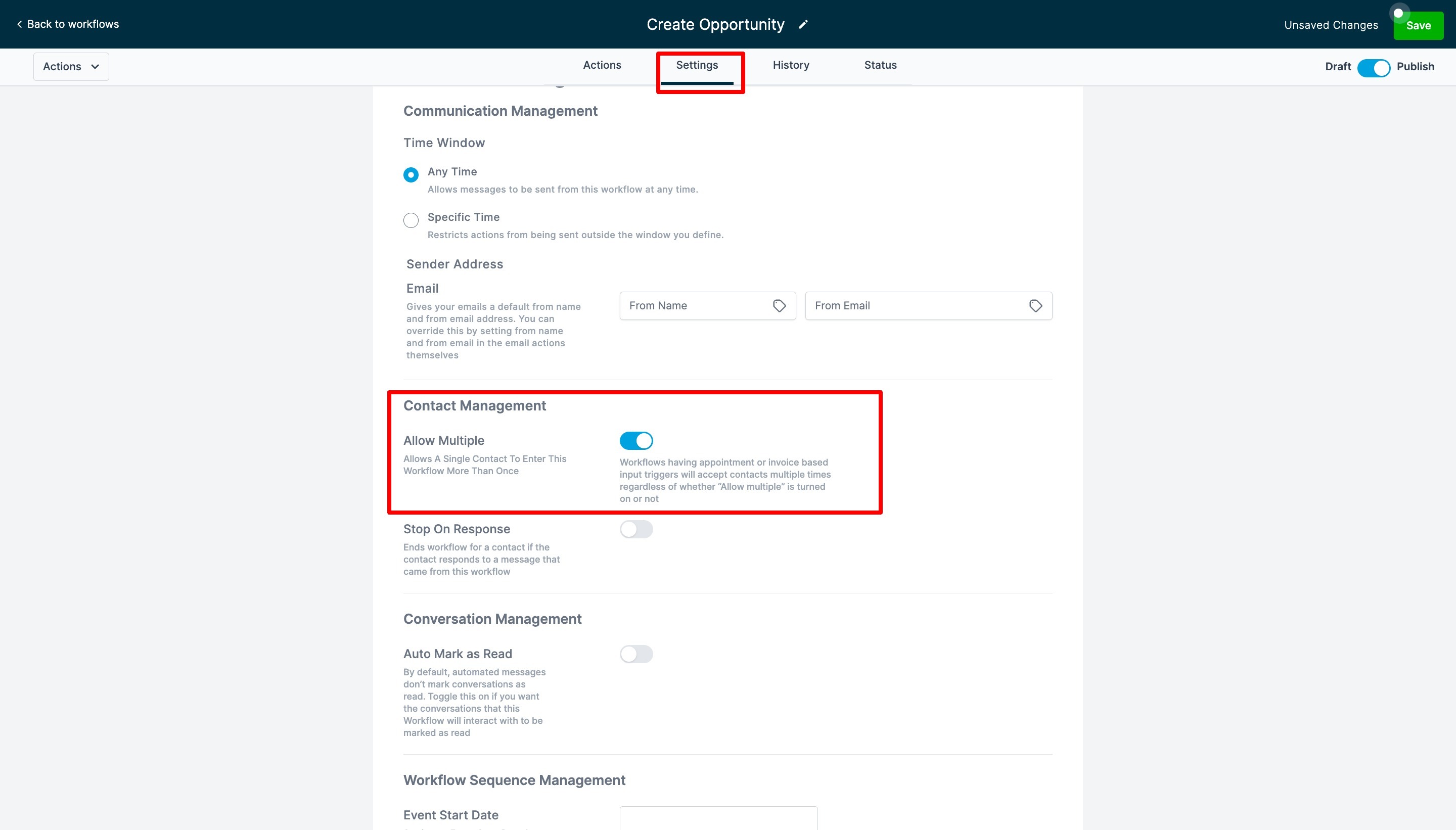 IMPORTANT Note - In Workflow Settings, please Allow Multiple contacts.