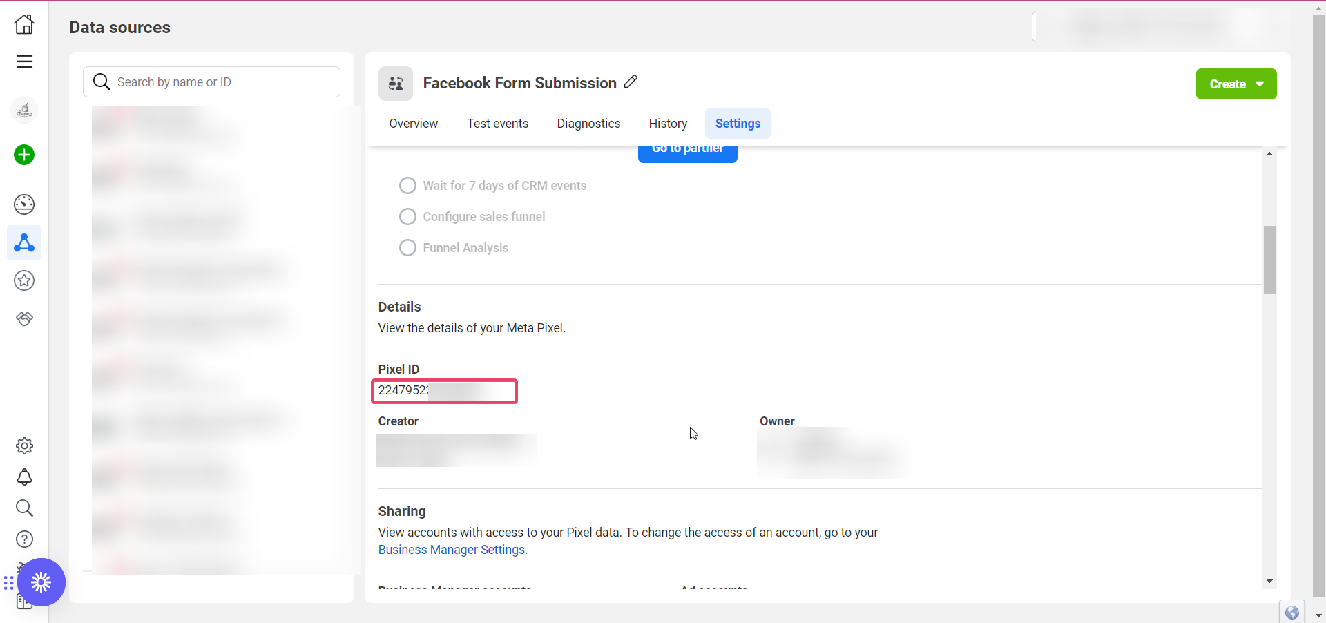 - Navigate to your Facebook Events Manager> Data Sources> Settings> Scroll down and copy your Pixel ID.