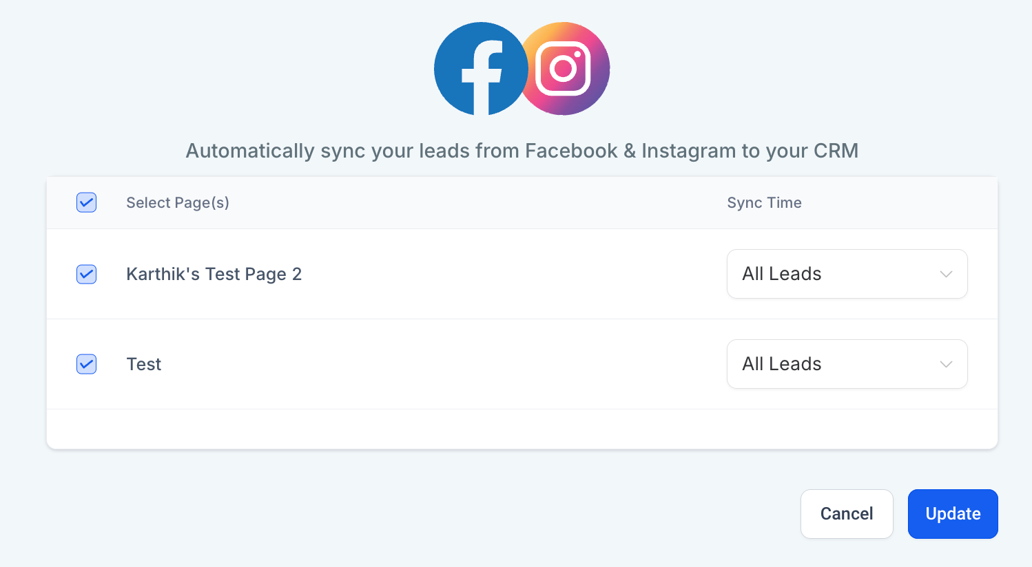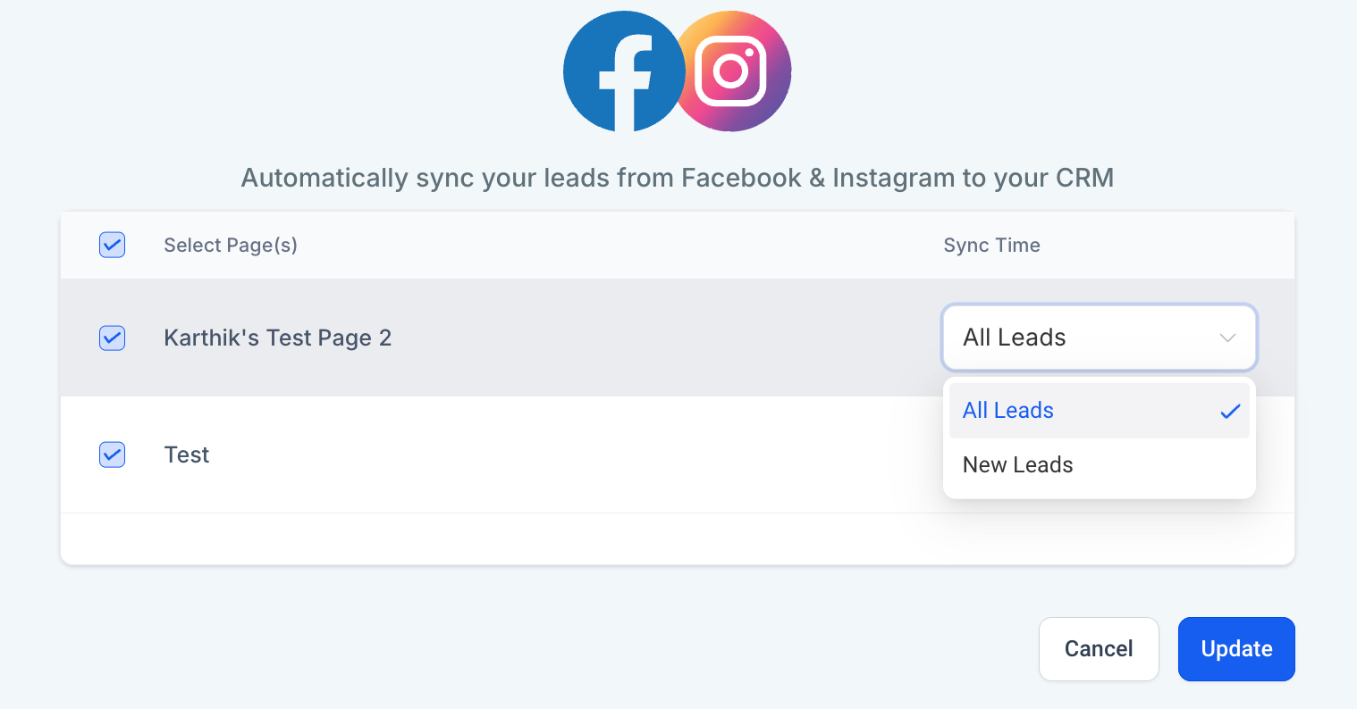 - Leads Sync: Sync leads automatically from Facebook Lead Ads across multiple pages with clear attribution to the source