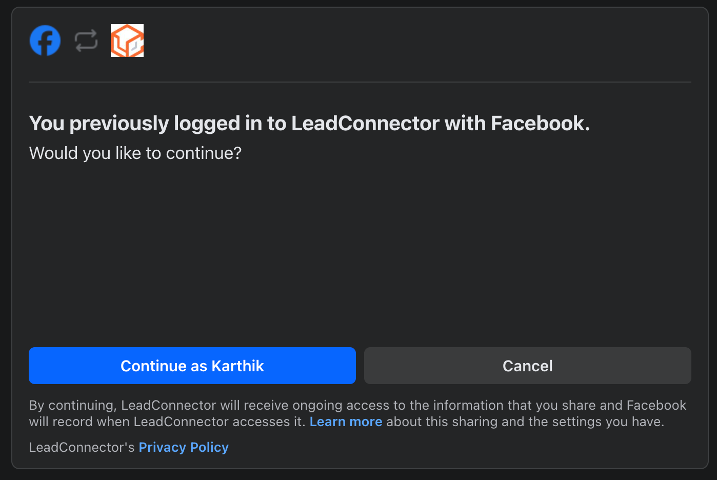 Step 2: Click on 'Connect', login to your Facebook account and approve all required permissions for LeadConnector to integrate with your Facebook account.