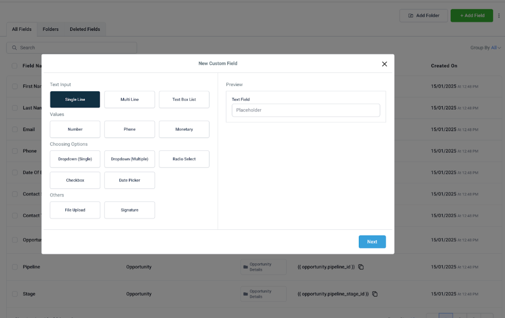 Enter the field name, type (text, dropdown, checkbox, date, etc.), and optionally group it under a custom section.