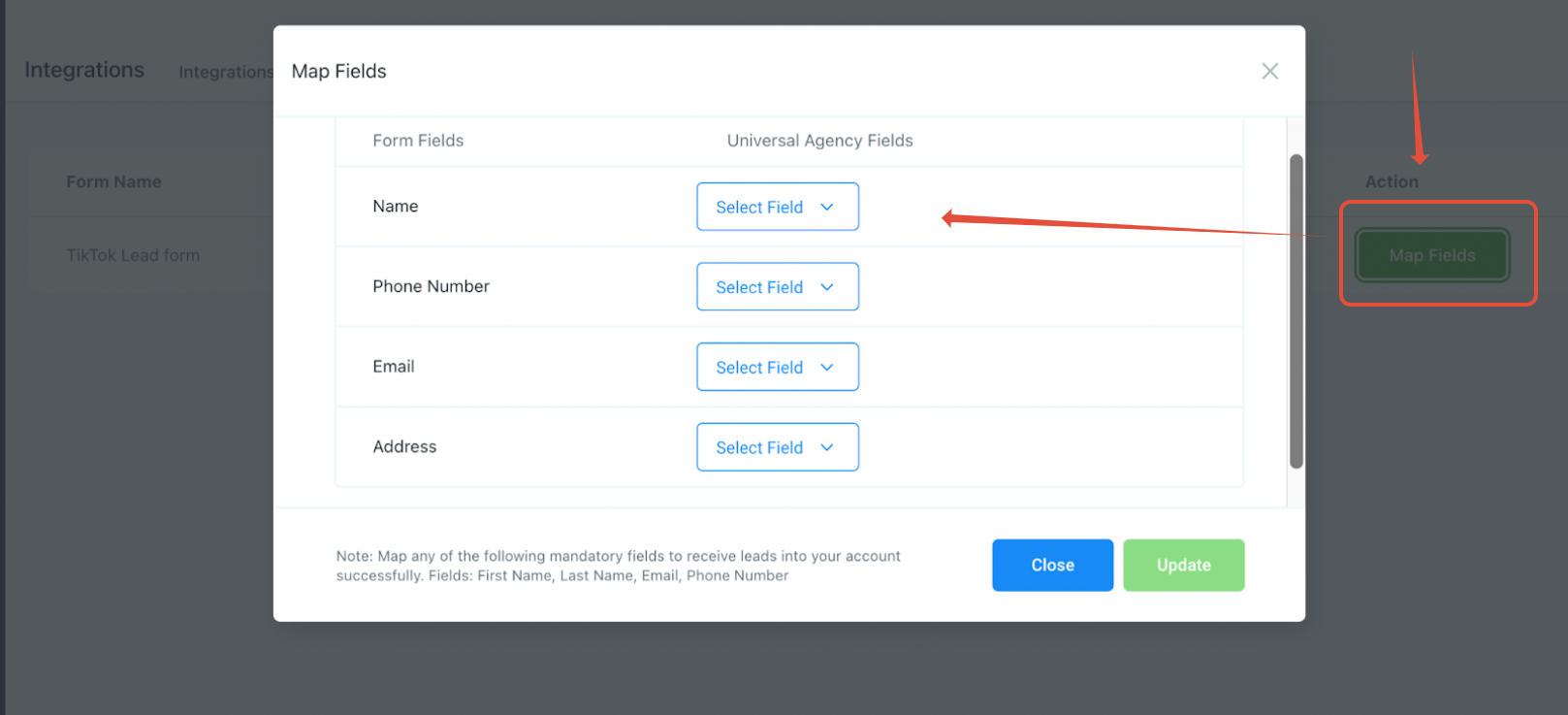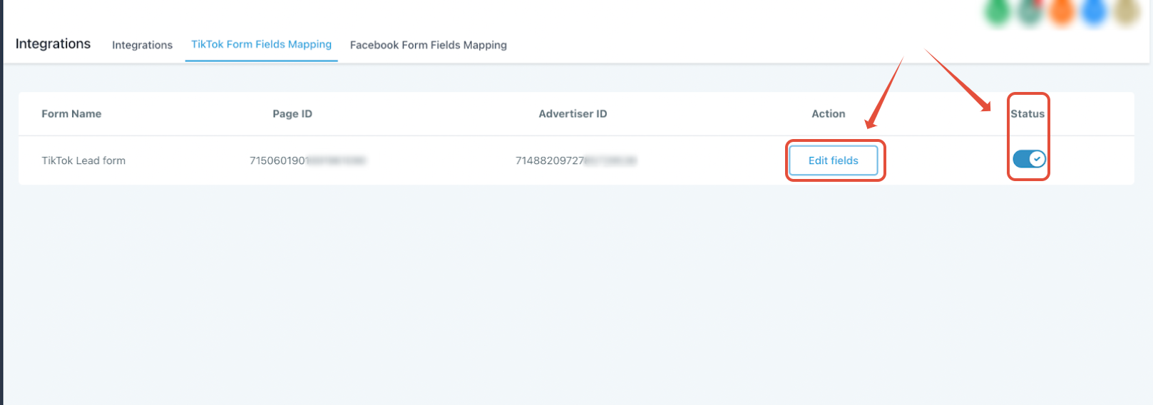 Once your Tiktok business account is connected please navigate to the TikTok form mapping tab to see all the pages/forms you have created in the TikTok business