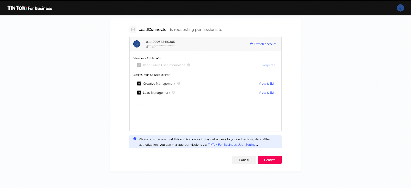 Now that the TikTok Integration is live in your sub-account. Please proceed to log into your TikTok Business Account
