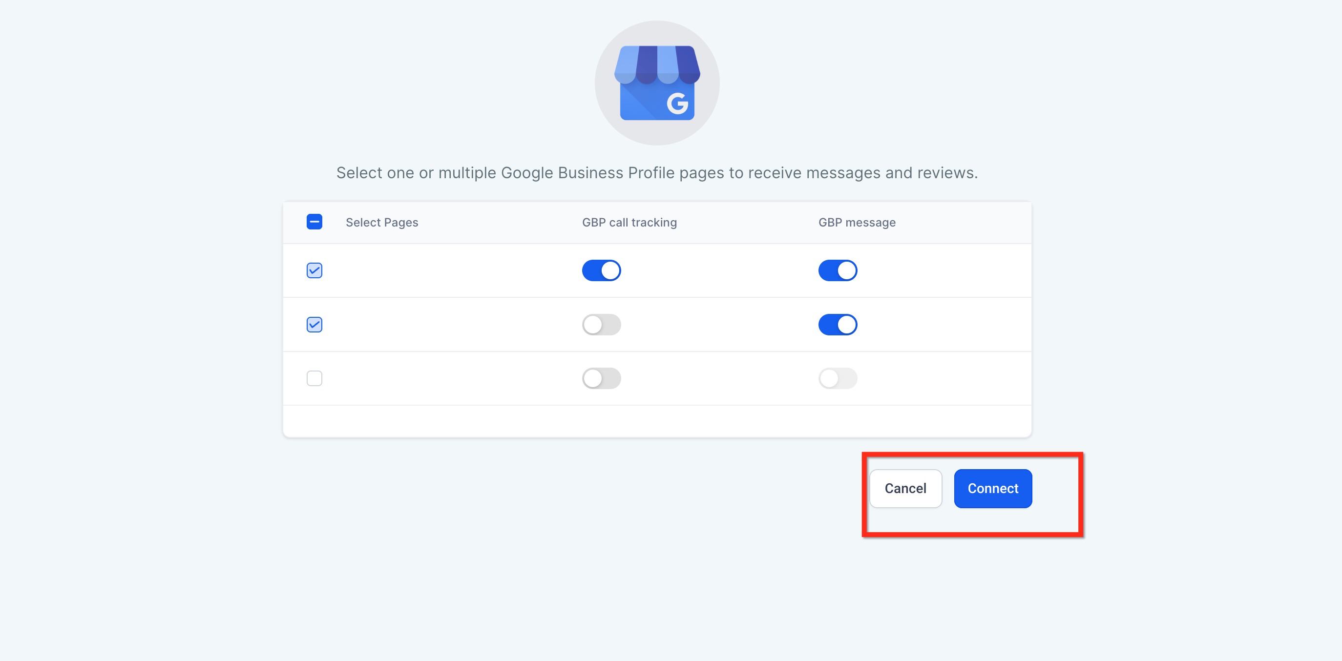 You may select a single page or multiple pages during this step. Each selected page will be connected to your account and made available for message handling, lead visibility, and review monitoring.