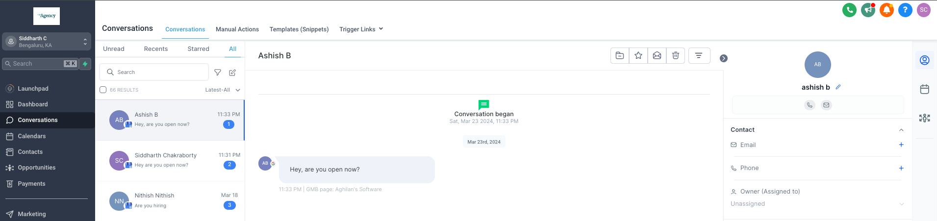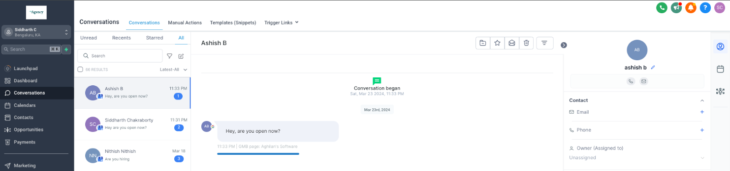 When a customer visits your GBP page and sends a message via the chat section, the message is fetched in the connected sub-account under the Conversations page.