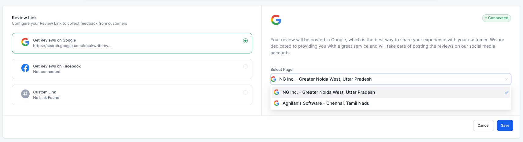 If multiple pages are connected to a sub-account, you can configure the reviews link for each one and select a primary page. This allows you to send your contacts a review request link to gather more Google reviews for your business.