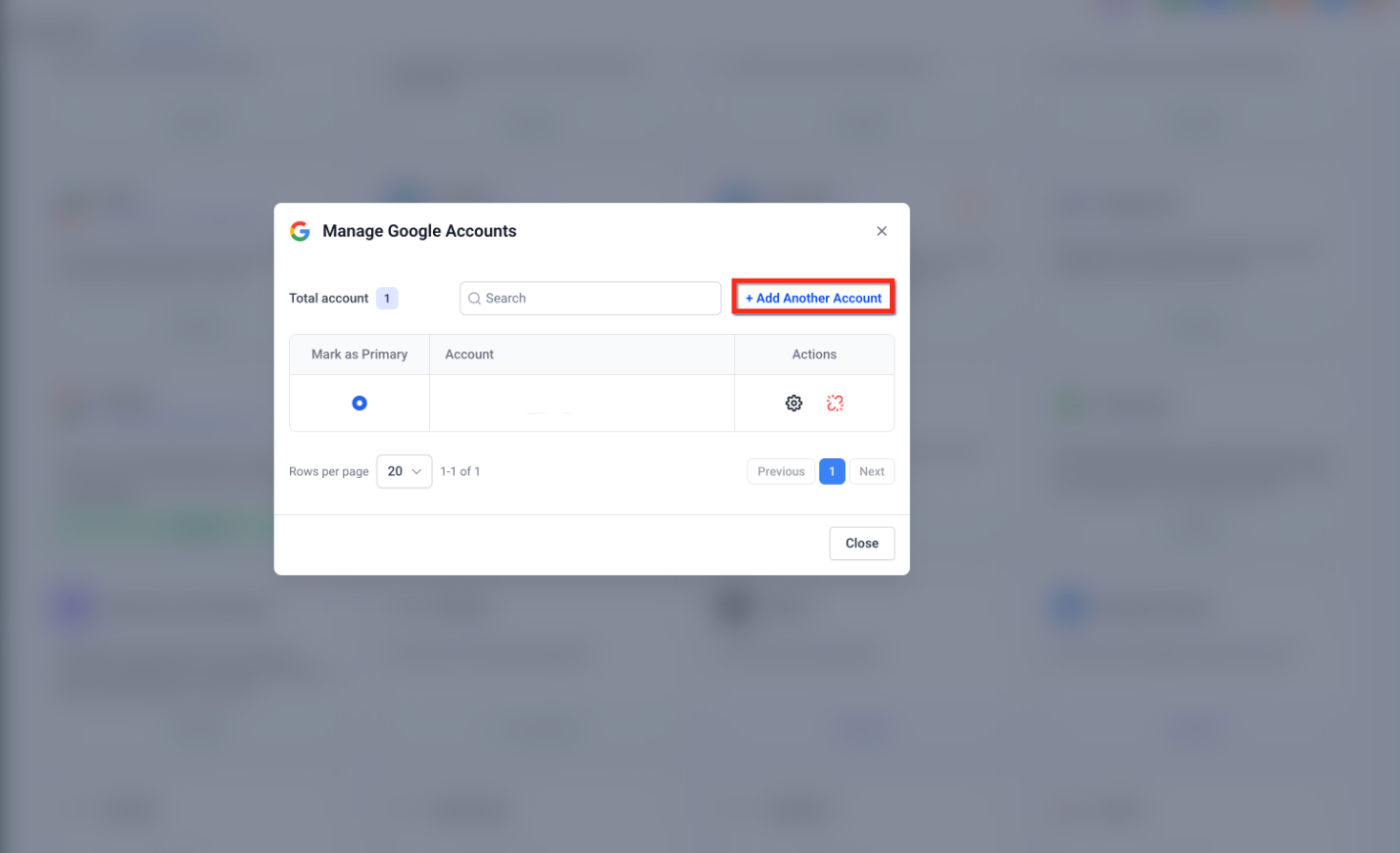 Selecting Manage opens a dedicated account management panel. From here, you can review existing connections, add additional Google accounts, or remove individual ones as needed.
