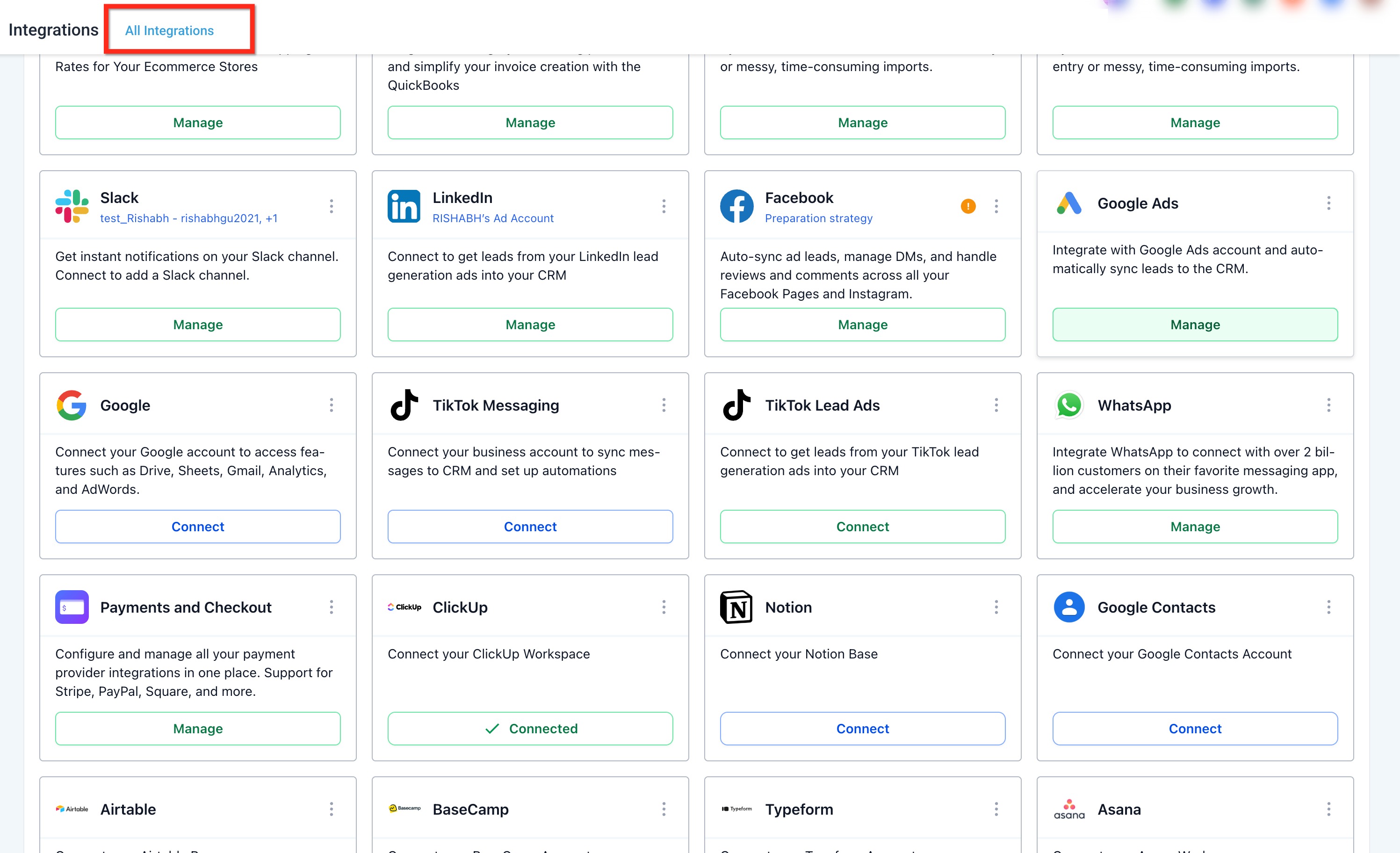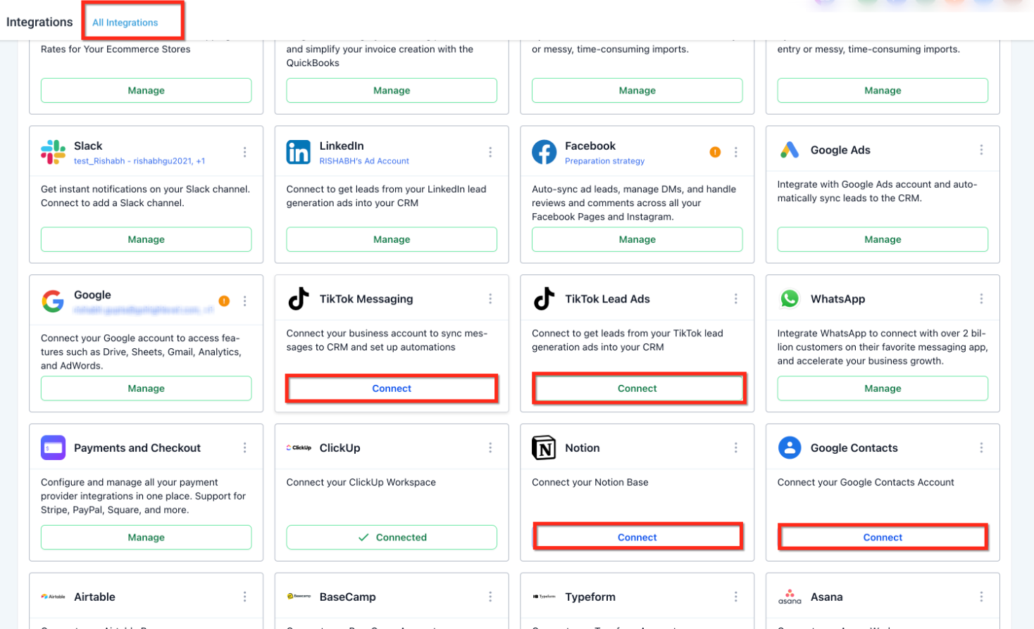 Once connected, supported Google features become accessible from one place, and the connection status changes from Connect to Manage.
