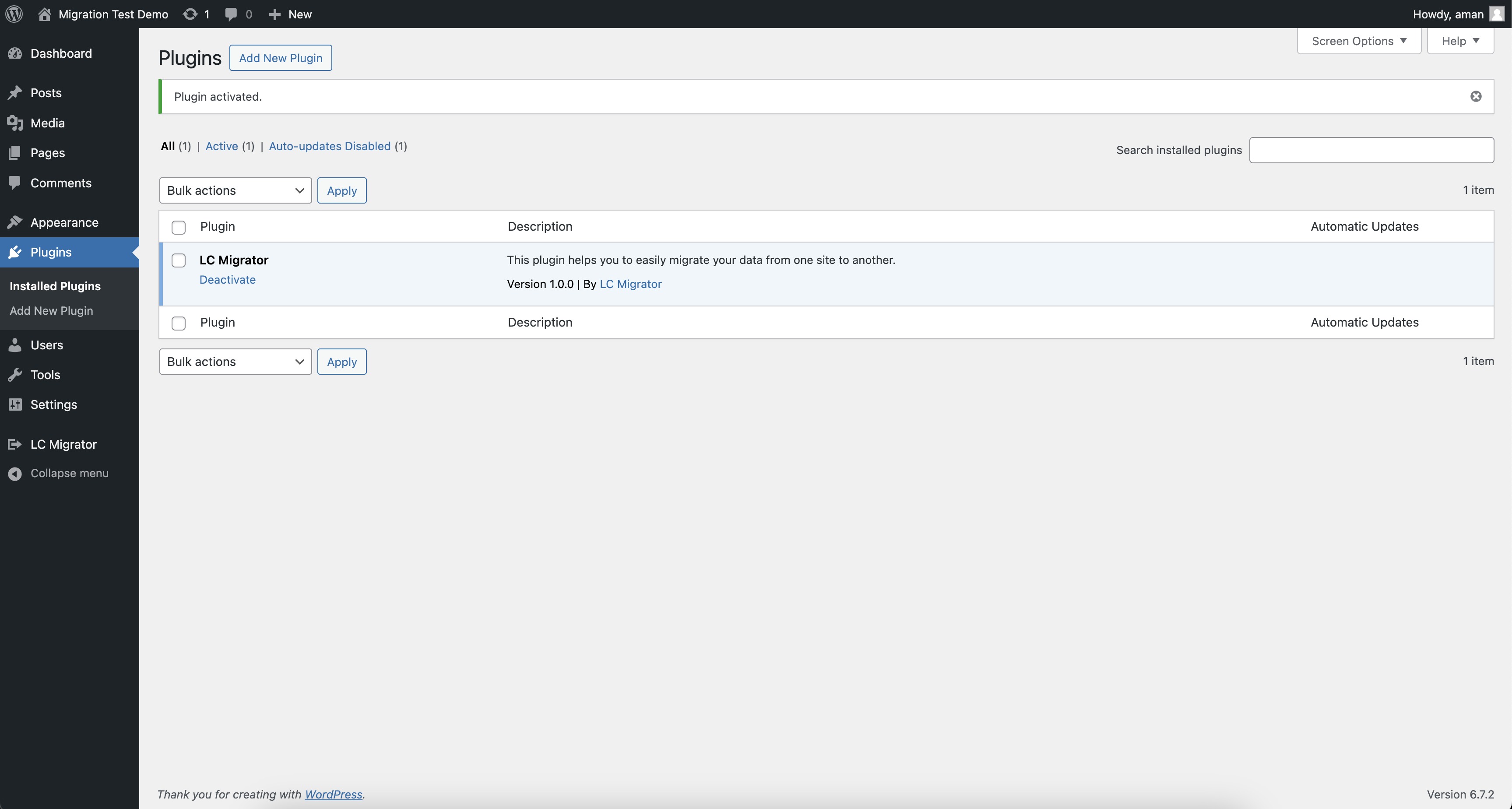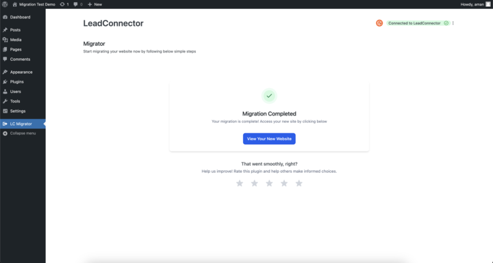 In the WordPress sidebar, locate and click on LC Migrator (you may need to scroll down).