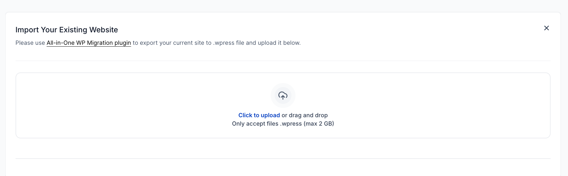 Click Choose File and upload the .wpress file (Max size: 2GB).