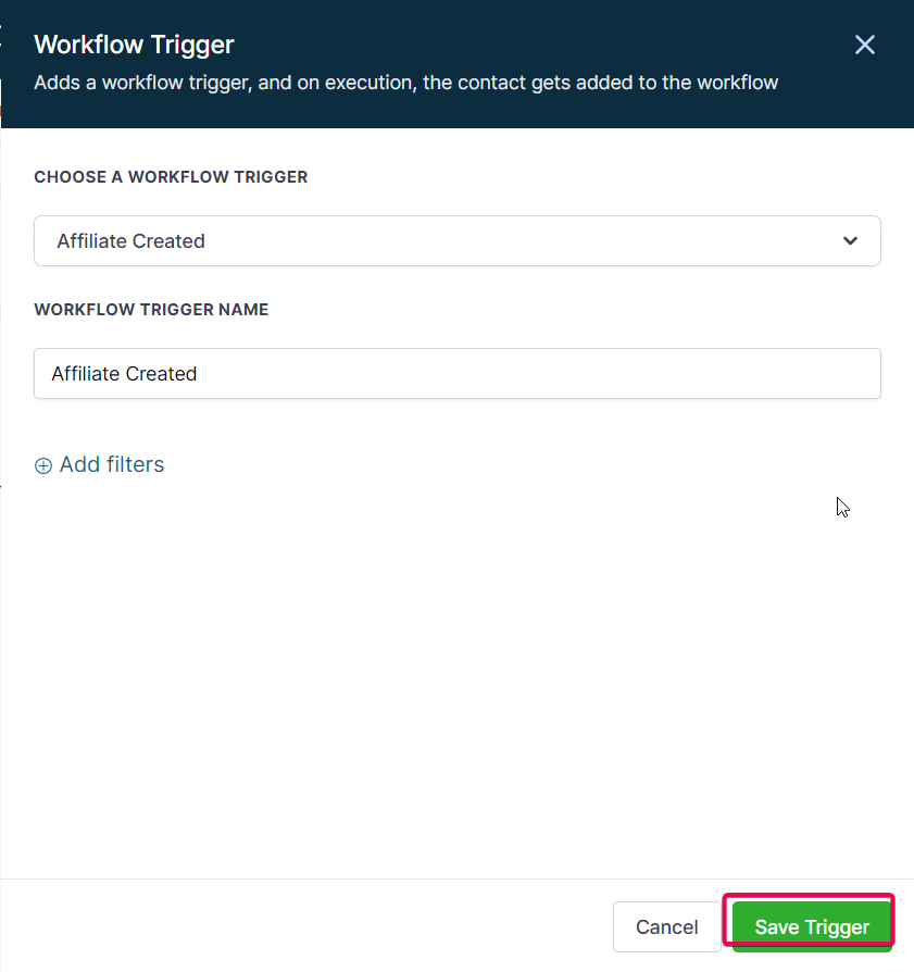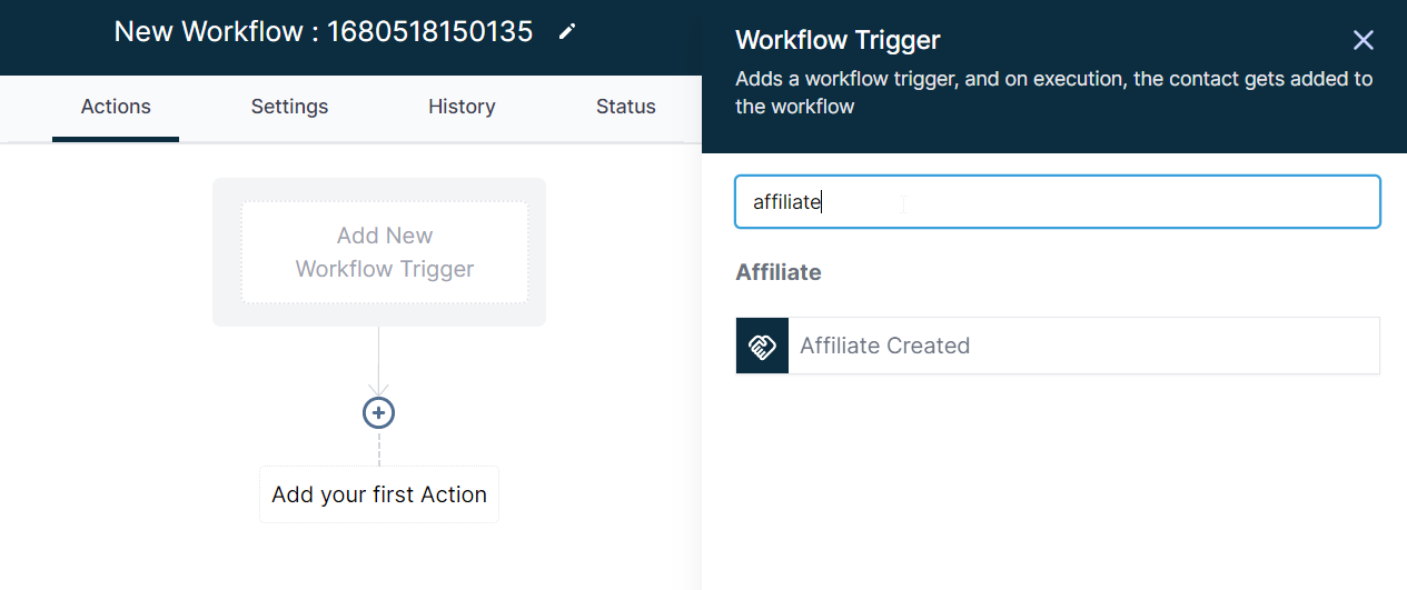 Click on Add new Workflow Trigger>Search for Affiliate Created>Choose i.t